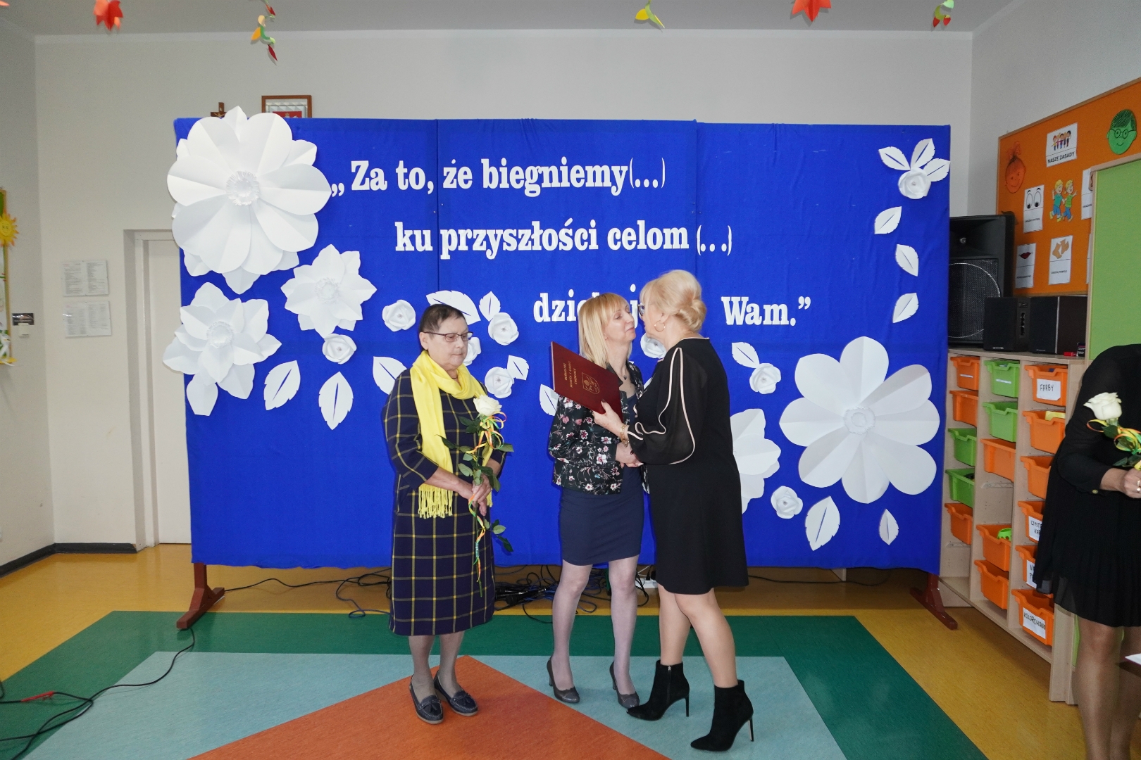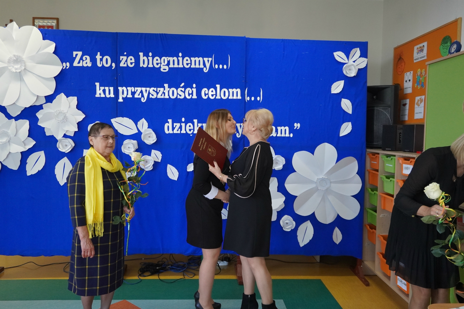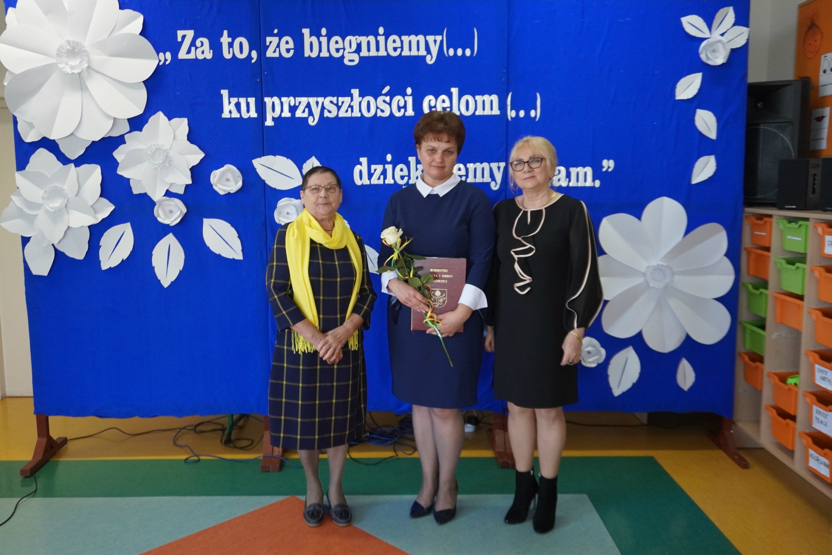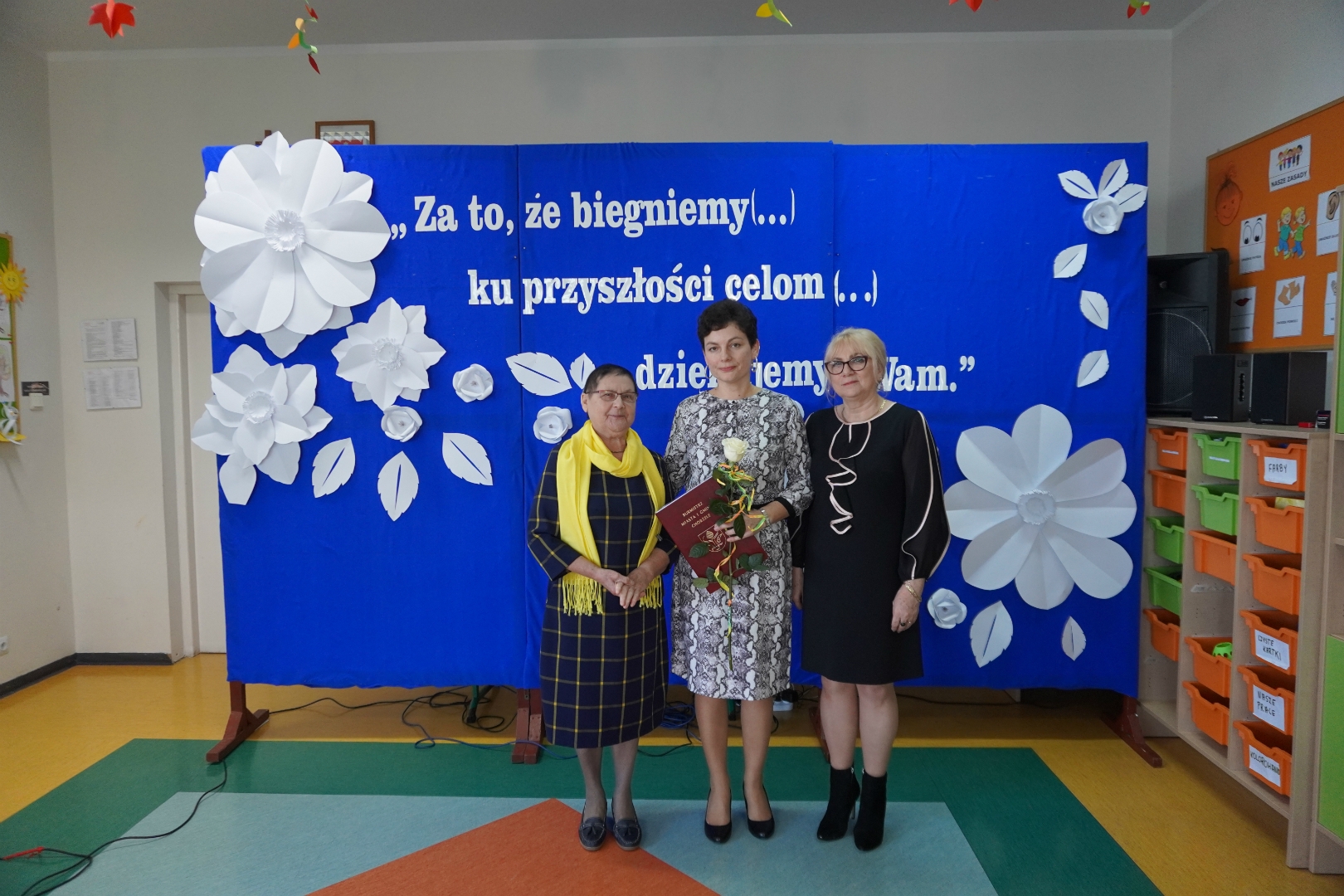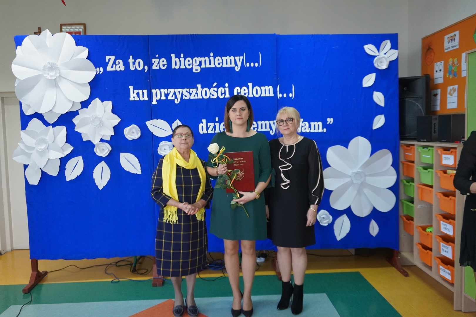 Burmistrz doceniła oraz wręczyła list gratulacyjny Kazimierze Kowalskiej -emerytowanej nauczycielce. Podziekowania otrzymała również Wanda Jastrzębska - radna Rady Miejskiej w Chorzelach oraz Ryszard Jastrzębski - Przewodniczący Ogniska Emerytów Związku Nauczycielstwa Polskiego w Chorzelach. Uroczystość poprowadziła Izabela Jurczewska, Dyrektor Wydziału Oświaty Miasta i Gminy Chorzele.