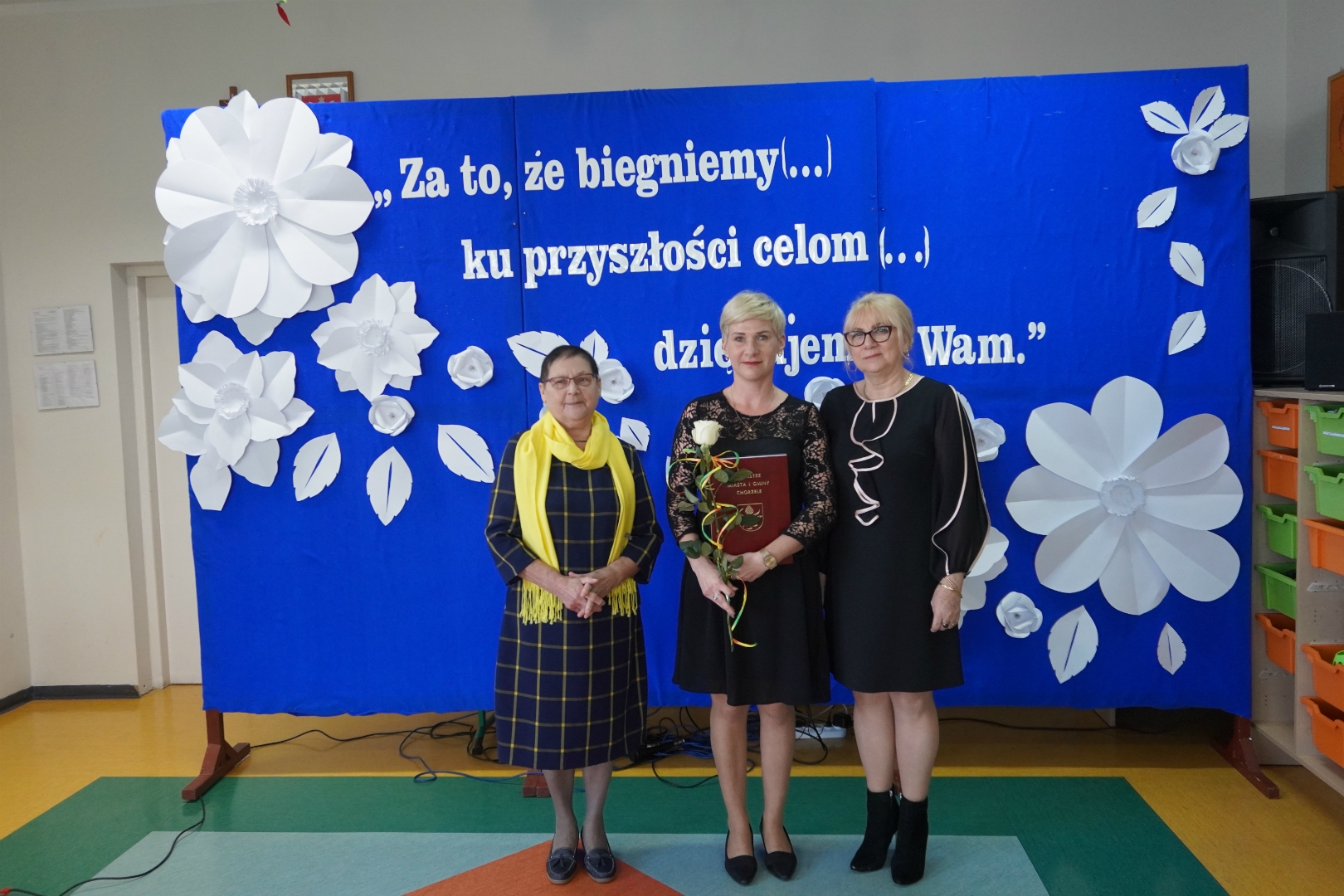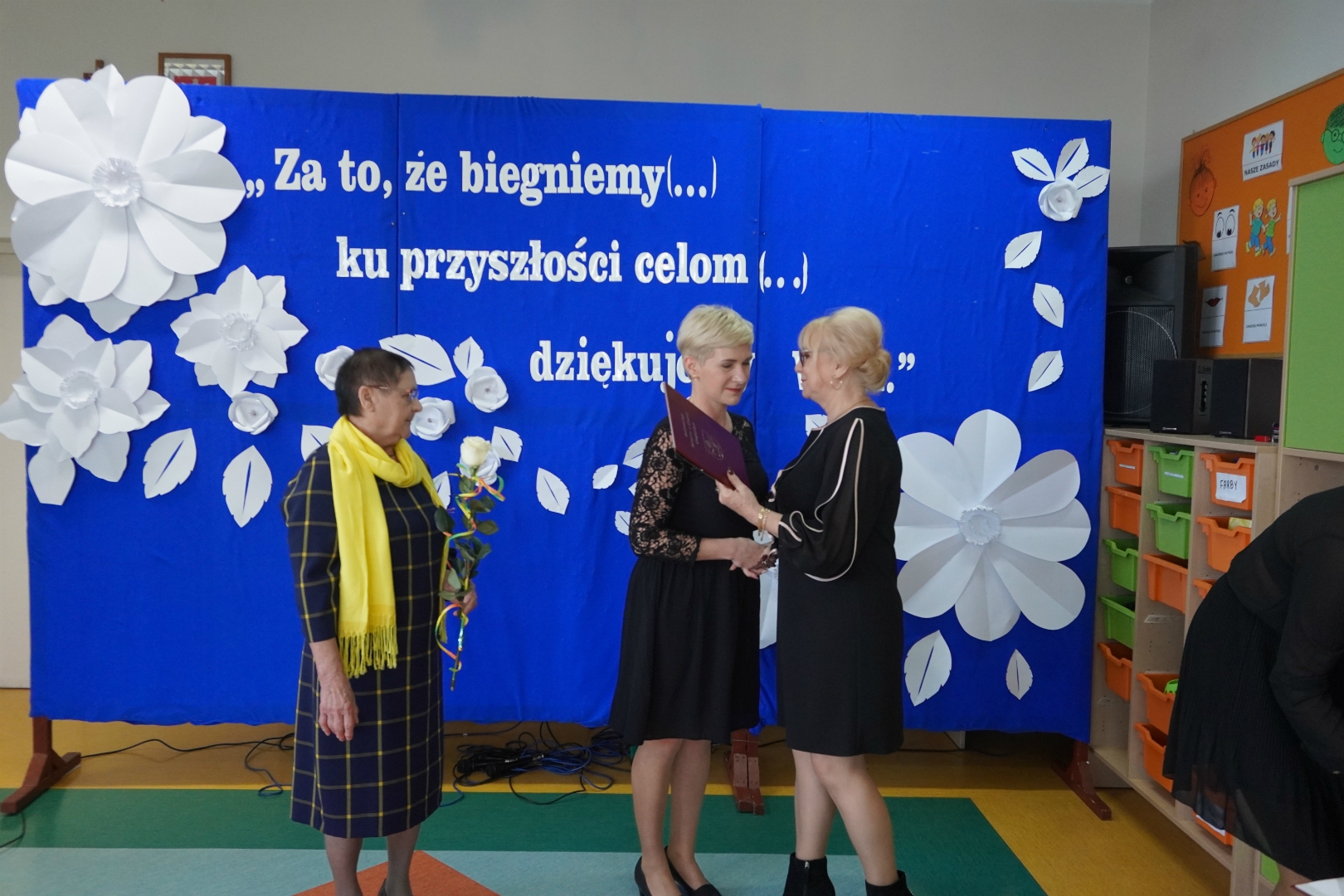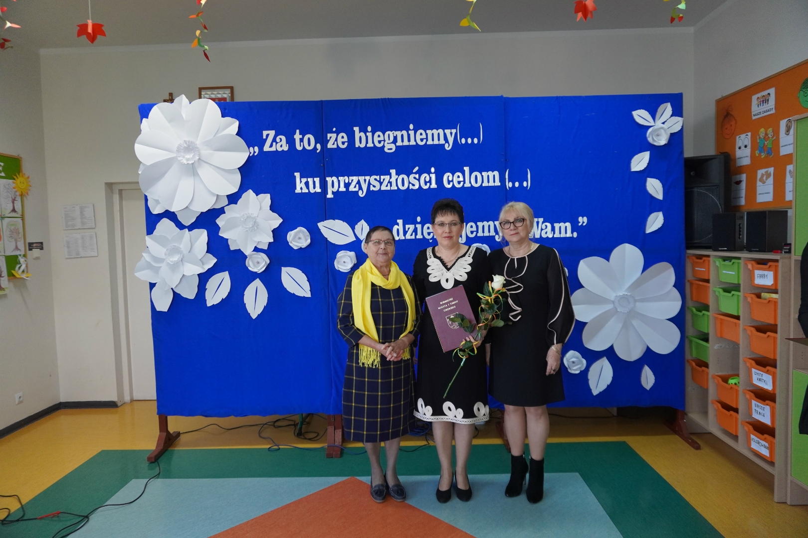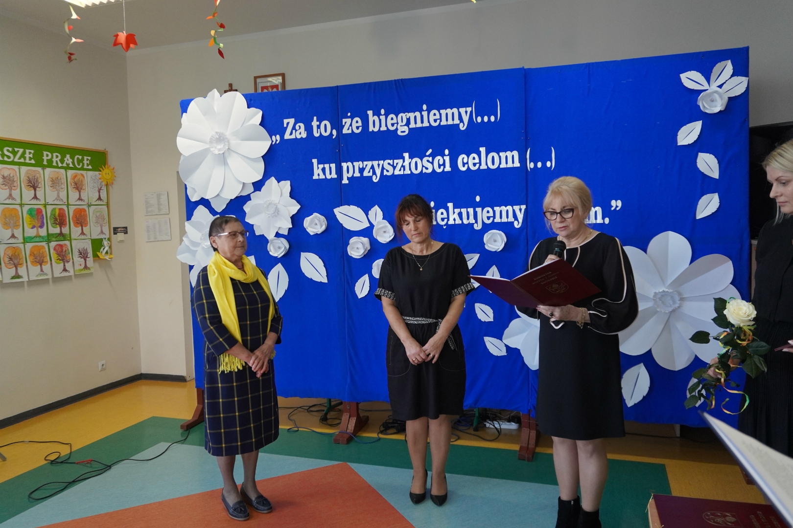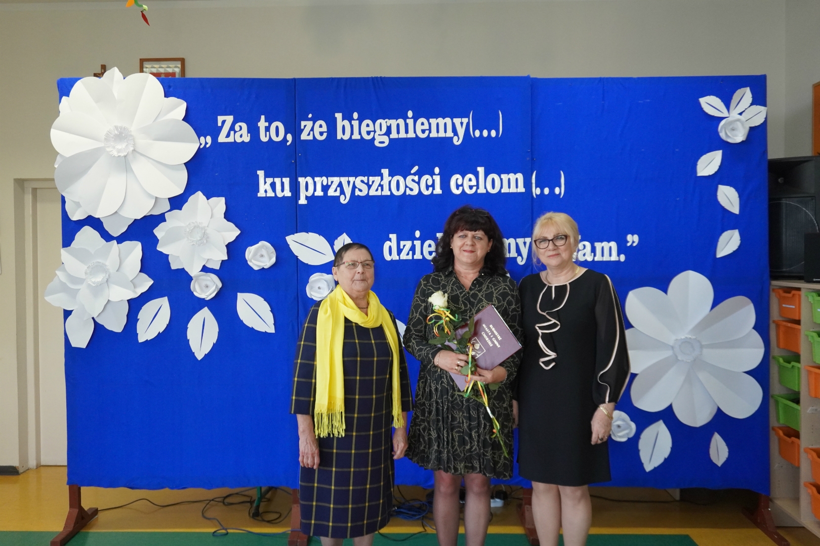Burmistrz doceniła oraz wręczyła list gratulacyjny Kazimierze Kowalskiej -emerytowanej nauczycielce. Podziekowania otrzymała również Wanda Jastrzębska - radna Rady Miejskiej w Chorzelach oraz Ryszard Jastrzębski - Przewodniczący Ogniska Emerytów Związku Nauczycielstwa Polskiego w Chorzelach. Uroczystość poprowadziła Izabela Jurczewska, Dyrektor Wydziału Oświaty Miasta i Gminy Chorzele.