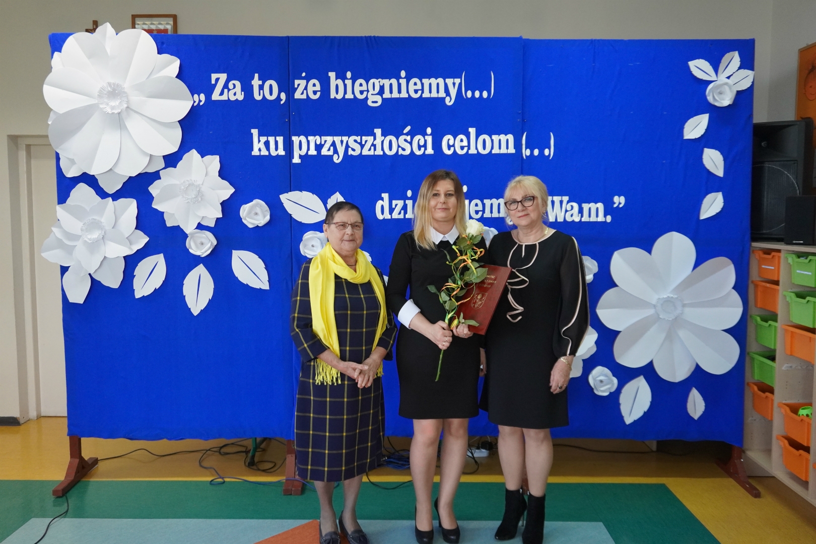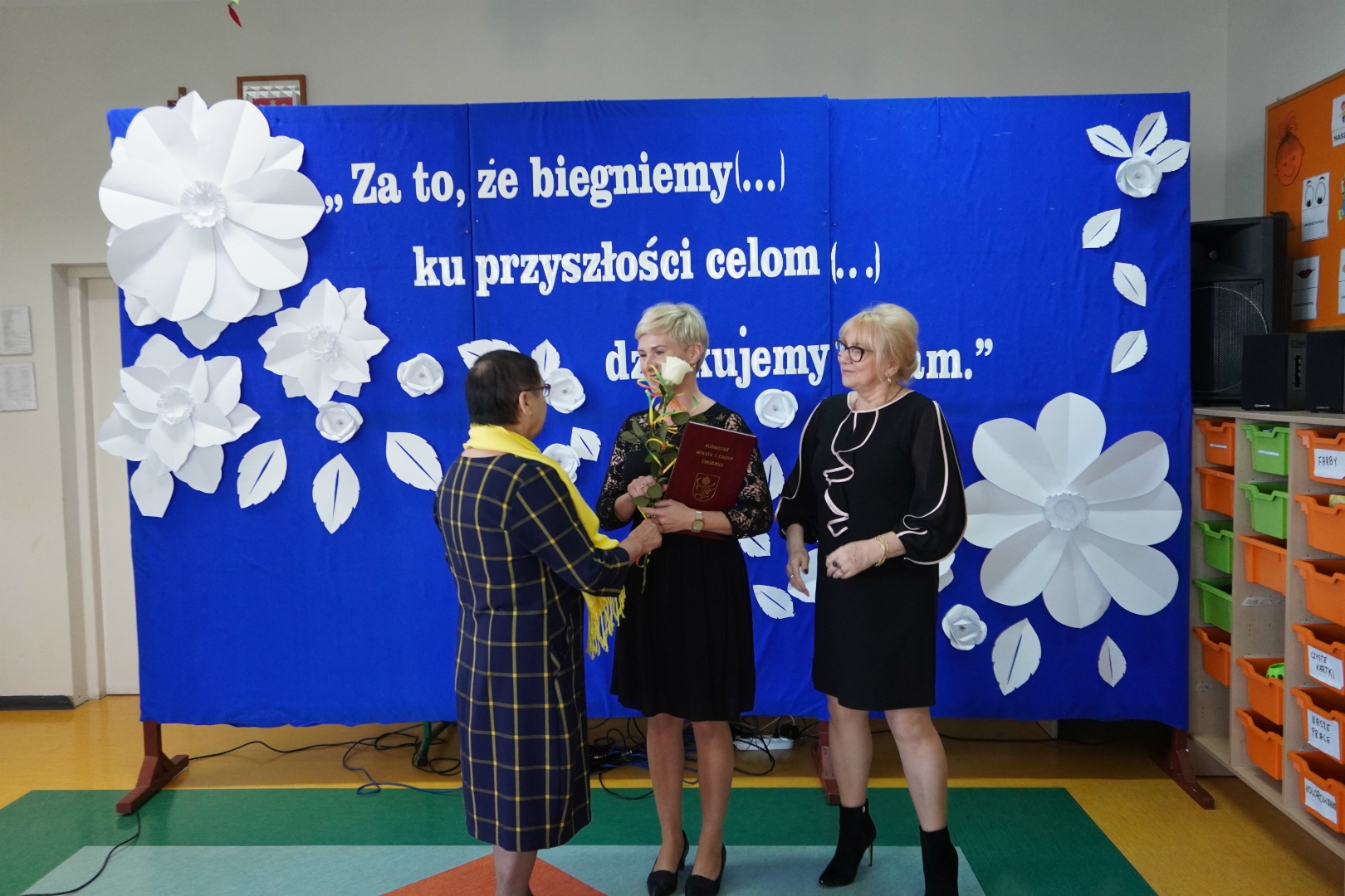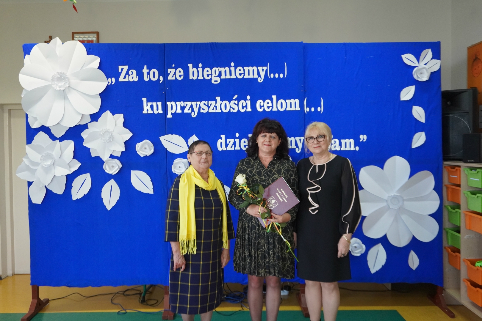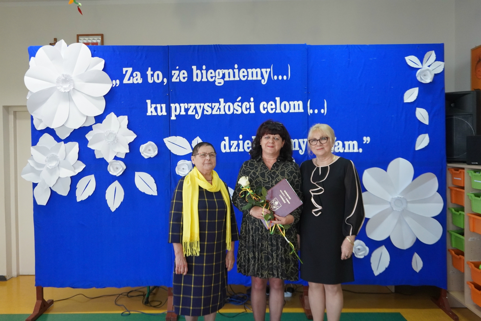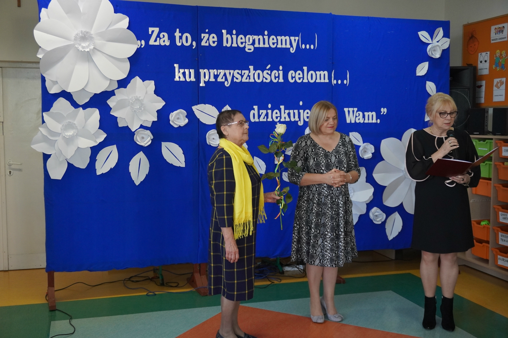 Burmistrz doceniła oraz wręczyła list gratulacyjny Kazimierze Kowalskiej -emerytowanej nauczycielce. Podziekowania otrzymała również Wanda Jastrzębska - radna Rady Miejskiej w Chorzelach oraz Ryszard Jastrzębski - Przewodniczący Ogniska Emerytów Związku Nauczycielstwa Polskiego w Chorzelach. Uroczystość poprowadziła Izabela Jurczewska, Dyrektor Wydziału Oświaty Miasta i Gminy Chorzele.
