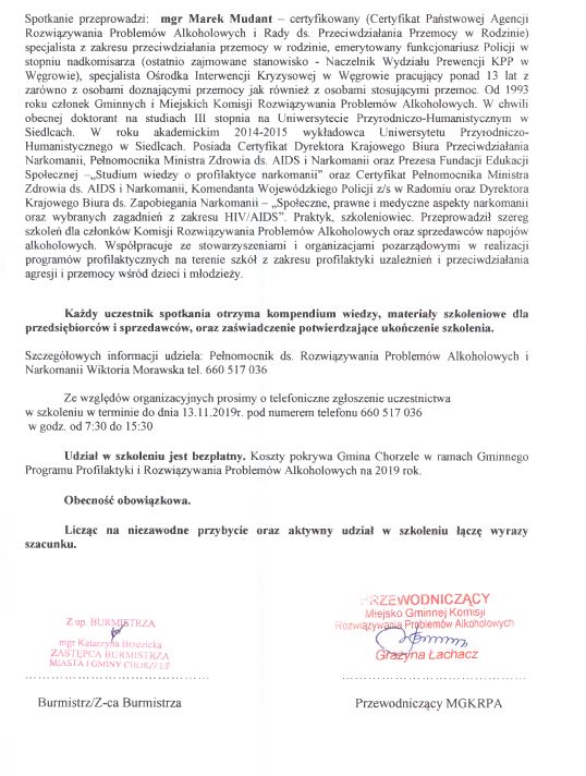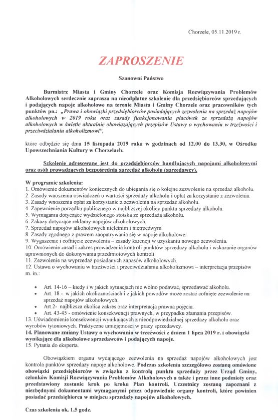 Burmistrz Miasta i Gminy Chorzele oraz Komisja Rozwiązywania Problemów Alkoholowych serdecznie zaprasza na nieodpłatne szkolenie dla przedsiębiorców sprzedających i podających napoje alkoholowe na terenie Miasta i Gminy Chorzele oraz pracowników tych punktów pn.: „Prawa i obowiązki przedsiębiorców posiadających zezwolenia na sprzedaż napojów alkoholowych w 2019 roku oraz zasady funkcjonowania placówek ze sprzedażą napojów alkoholowych w świetle aktualnie obowiązujących przepisów Ustawy o wychowaniu w trzeźwości i przeciwdziałaniu alkoholizmowi"