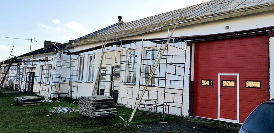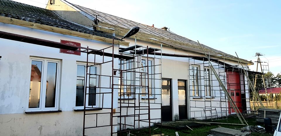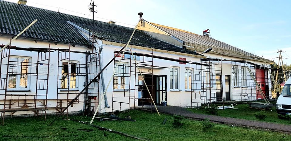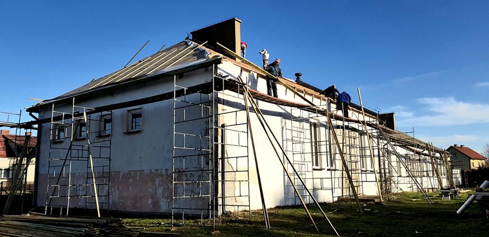 Na Świetlicy w Krukowie jest obecnie zdejmowane stare pokrycie dachowe z eternitu i zastępowane blachodachówką. Po remoncie i konserwacji, zostanie zamontowany sufit podwieszany wraz z nowym oświetleniem na sali głównej.