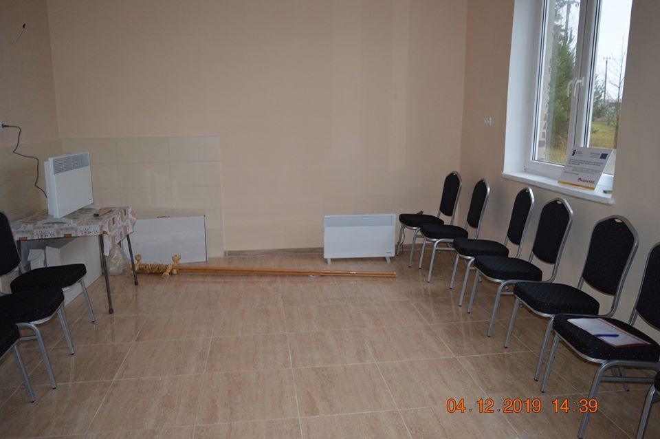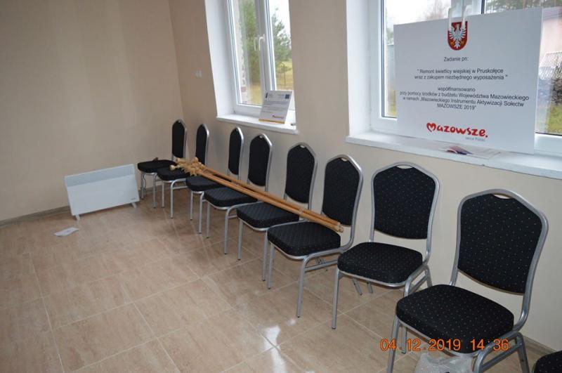 W świetlicy wiejskiej w Pruskołęce, Gmina wyremontowała pomieszczenia socjalne, zrobiono nowe podłogi, instalacje, wymieniono stolarkę drzwiową i okienną oraz zakupiono niezbędne wyposażenie w krzesła, stół i meble.