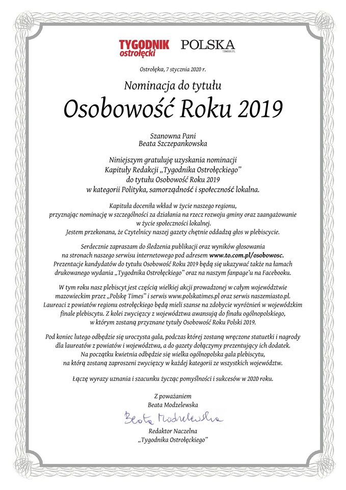 Mamy przyjemność poinformować, że nasza burmistrz Beata Szczepankowska otrzymała nominację Kapituły Redakcyjnej Tygodnika Ostrołęckie-PolskaTimes do tytułu Osobowość Roku 2019 w kategorii: Polityka, samorządność i społeczność lokalna.
