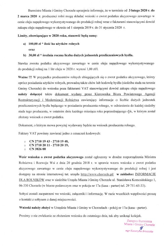 Burmistrz Miasta i Gminy Chorzele uprzejmie informuje, że w terminie od 3 lutego 2020 r. do 2 marca 2020 r. producenci rolni mogą składać wnioski o zwrot podatku akcyzowego zawartego w cenie oleju napędowego wykorzystywanego do produkcji rolnej wraz z fakturami stanowiącymi dowód zakupu oleju napędowego w okresie od 1 sierpnia 2019 r. do 31 stycznia 2020 r.