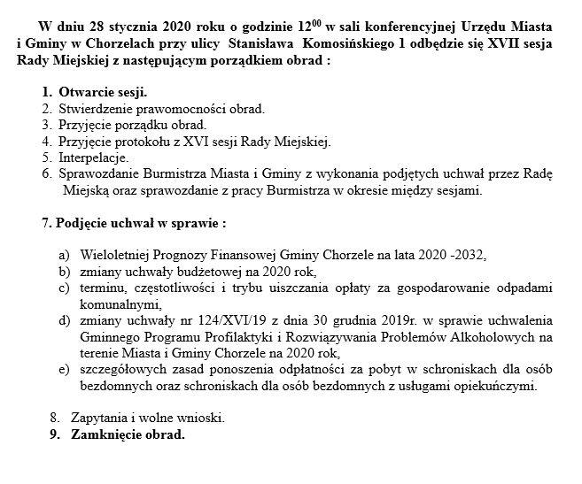 W dniu 28 stycznia 2020 roku o godzinie 1200 w sali konferencyjnej Urzędu Miasta i Gminy w Chorzelach przy ulicy Stanisława Komosińskiego 1 odbędzie się XVII sesja Rady Miejskiej.