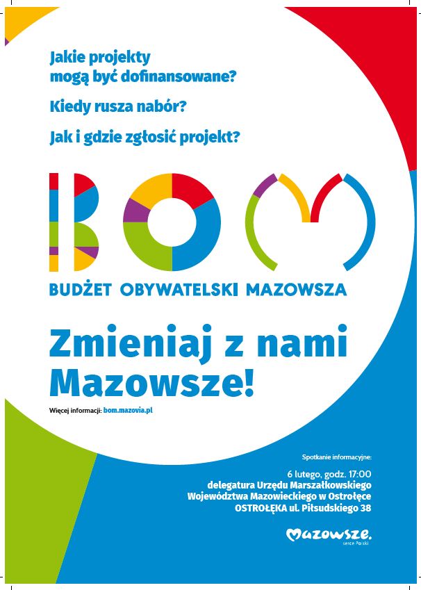 Serdecznie zapraszamy na spotkanie informacyjne dotyczące Budżetu Obywatelskiego Mazowsza, które odbędzie się 6 lutego o godz. 17:00 w budynku delegatury Urzędu Marszałkowskiego Województwa Mazowieckiego w Ostrołęce (ul. Piłsudskiego 38).