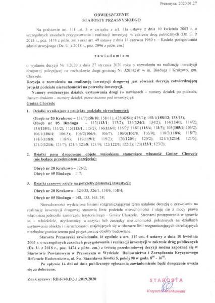 Obwieszczenie Starosty Przasnyskiego o wydaniu decyzji nr 1/2020 z dnia 27 stycznia 2020 o zezwoleniu na realizację inwestycji droowej polegającej na rozbudowie drogi gminnej Nr 320142W w m. Binduga i Krukowo, gm. Chorzele.