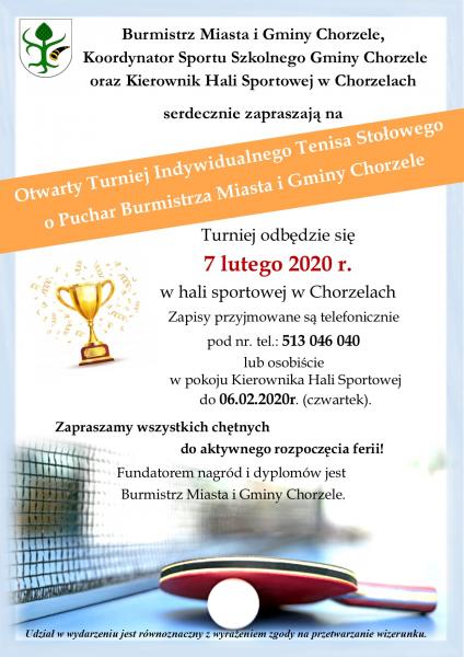 Burmistrz Miasta i Gminy Chorzele, Koordynator Sportu Szkolnego Gminy Chorzele oraz Kierownik Hali Sportowej w Chorzelach serdecznie zapraszają na Otwarty Turniej Indywidualnego Tenisa Stolowego o Puchar Burmistrza Miasta i Gminy Chorzele. Turniej odbędzie się 7 lutego 2020 r. w hali sportowej w Chorzelach. Zapisy przyjmowane są telefonicznie pod nr. tel.: 513 046 040 lub osobiście w pokoju Kierownika Hali Sportowej do 06.02.2020r. (czwartek).