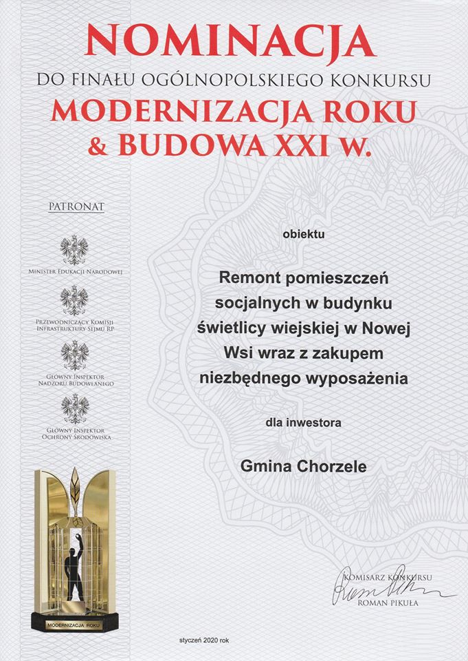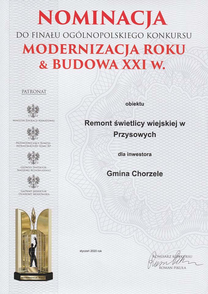 Miło nam poinformować, że aż 7 inwestycji Gminy Chorzele otrzymało nominacje w Ogólnopolskim Konkursie Modernizacja Roku i Budowa XXI wieku!
