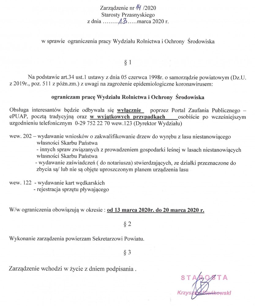 Ograniczenie pracy Wydziału Rolnictwa i Ochorny Środowiska w Starostwie Powiatowym w Przasnyszu
