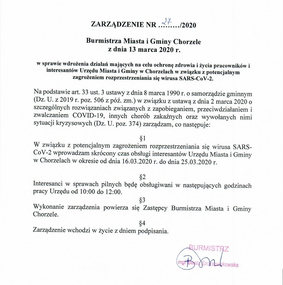 Uprzejmie informujemy, że od 16.03.2020r. do dnia 25.03.2020r. interesanci Urzędu Miejskiego w Chorzelach będą obsługiwani jedynie w wydzielonym punkcie obsługi przy wejściach do Urzędu w godzinach od 10:00 do 12:00.