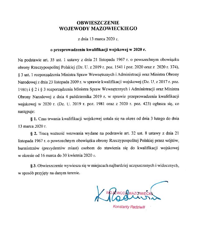 Kwalifikacja wojskowa zakończona - obwieszczenie Wojewody Mazowieckiego