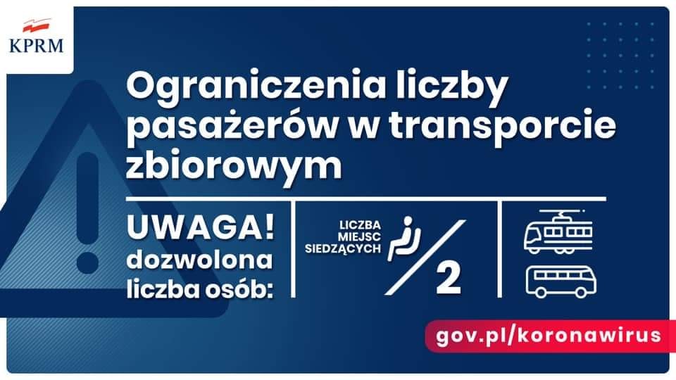 Środki publicznego transportu zbiorowego nadal działają. Jednak w autobusie, tramwaju lub metrze tylko połowa miejsc siedzących może być zajęta. Jeśli miejsc siedzących w pojeździe jest 70, to na jego pokładzie może znajdować się maksymalnie 35 osób.