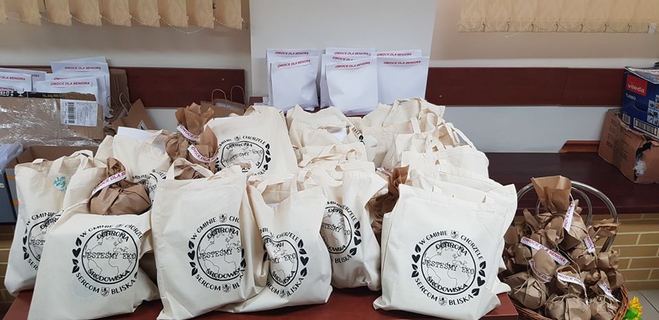 Pracownicy OPS i Urzędu Gminy już rozpoczęli bezpieczne dostarczanie zapakowanych w gminne ekologiczne torby promocyjne, zestawów zawierających: maseczki ochronne i rękawice ochronne, zestawy ekologicznej żywności i długopisów oraz listy burmistrz Beaty Szczepankowskiej z Wielkanocnymi Życzeniami.