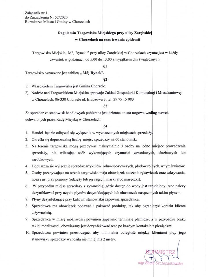Zarządzenie Burmistrza w sprawie łagodzenia od 7 maja ograniczeń związanych z funkcjonowaniem Targowiska Miejskiego przy ulicy Zarębskiej w Chorzelach oraz Regulamin Targowiska na czas trwania epidemii