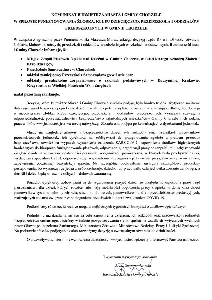 W związku z ogłoszoną przez Premiera Polski Mateusza Morawieckiego decyzją rządu RP o możliwości otwarcia żłobków, klubów dziecięcych, przedszkoli i oddziałów przedszkolnych w szkołach podstawowych, Burmistrz Miasta i Gminy Chorzele informuje, iż :