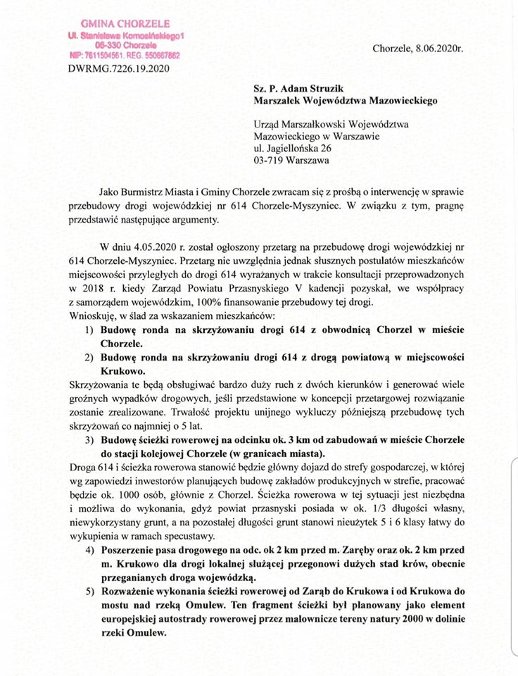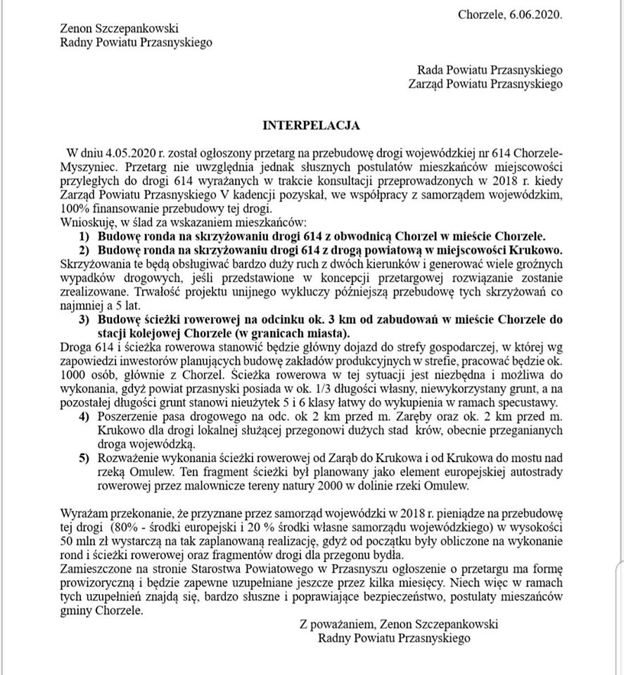W dniu 4.06.2020 r. został ogłoszony przez starostwo przetarg na przebudowę drogi wojewódzkiej nr 614 Chorzele-Myszyniec. Przetarg nie uwzględnia jednak, słusznych postulatów mieszkańców miejscowości przyległych do drogi 614, wyrażanych w trakcie konsultacji przeprowadzonych w 2018 r., kiedy Zarząd Powiatu Przasnyskiego V kadencji ze starostą Zenonem Szczepankowskim na czele, pozyskał, we współpracy z samorządem wojewódzkim, 100% finansowania przebudowy tej drogi.