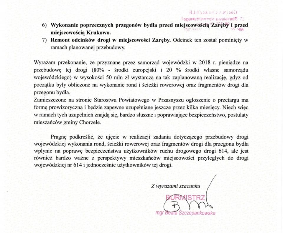 Burmistrz Miasta i Gminy Chorzele Beata Szczepankowska zwróciła się do marszałka Adama Struzika z prośbą o interwencję w sprawie przebudowy przez starostwo powiatowe w Przasnyszu drogi wojewódzkiej nr 614 Chorzele-Myszyniec. Interpelację w tej sprawie do nowych władz powiatu złożył również pierwszy starosta, obecnie radny powiatowy Zenon Szczepankowski, który w poprzedniej kadencji pozyskał na przebudowę tej drogi środki finansowe.