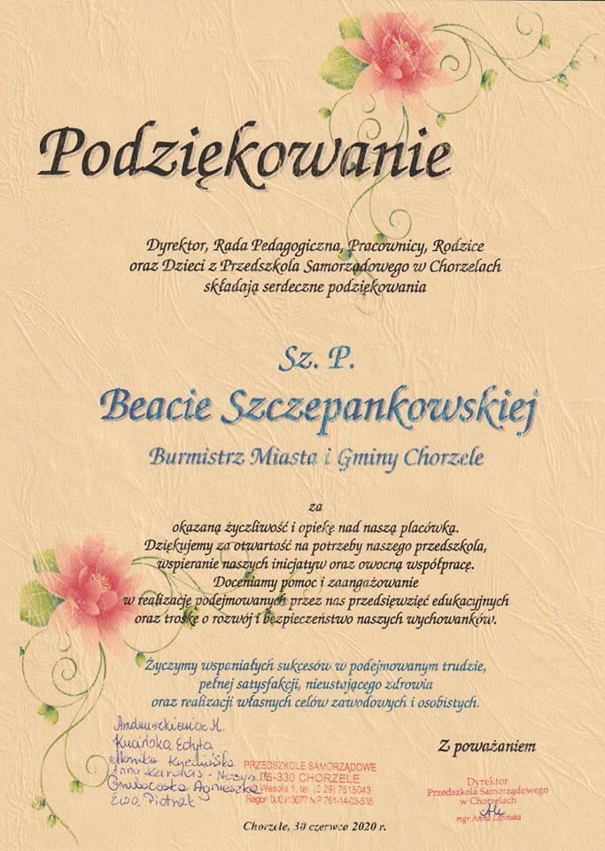 Podziękowanie dla burmistrz Beaty Szczepankowskiej od Dyrektor, Rady Pedagogicznej, Pracowników, Rodziców oraz Dzieci z Przedszkola Samorządowego w Chorzelach za okazaną życzliwość, wsparcie, opiekę nad placówką i owocną współpracę.