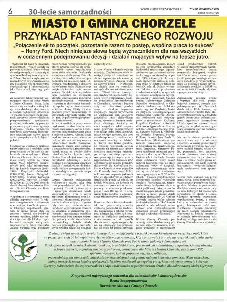MIASTO I GMINA CHORZELE – PRZYKŁAD FANTASTYCZNEGO ROZWOJU - materiał z okazji 30-lecia samorządu terytorialnego.