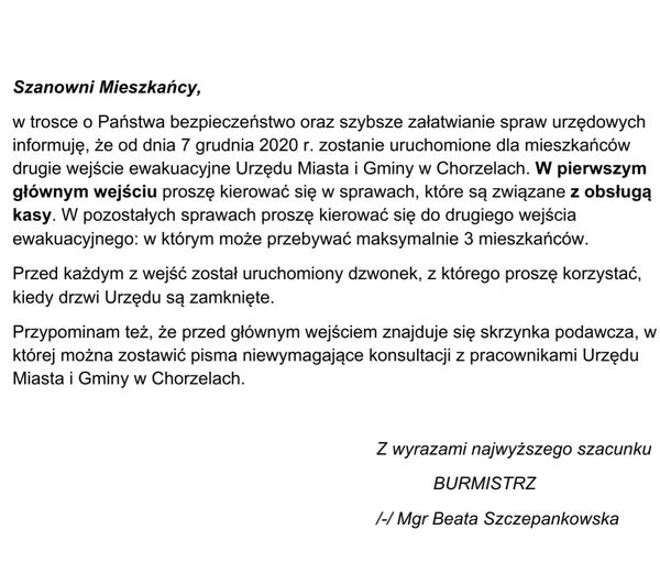 w trosce o Państwa bezpieczeństwo oraz szybsze załatwianie spraw urzędowych informuję, że od dnia 7 grudnia 2020 r. zostanie uruchomione dla mieszkańców drugie wejście ewakuacyjne Urzędu Miasta i Gminy w Chorzelach.