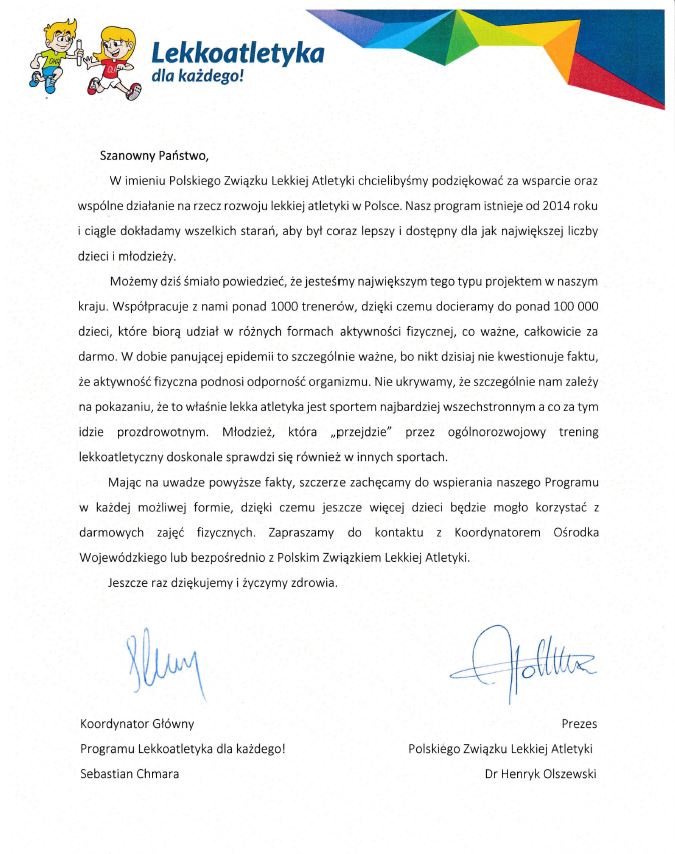 Podziękowanie od Polskiego Związku Lekkiej Atletyki za wsparcie oraz wspólne działanie na rzecz rozwoju lekkiej atletyki w Polsce.