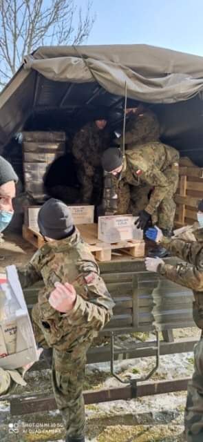 Poniższe zdjęcie prezentują żołnierzy WOT pomagających przy dostarczeniu i transporcie żywności.