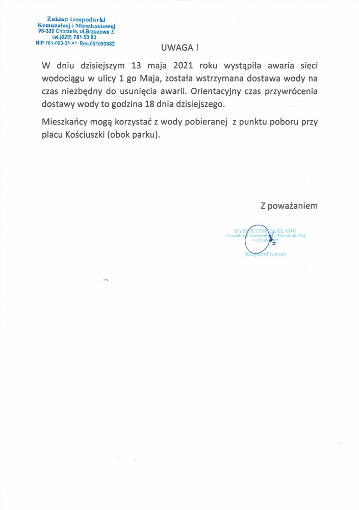 W dniu dzisiejszym 13 maja 2021 roku, wystąpiła awaria sieci wodociągu w ulicy 1 go Maja, została wstrzymana dostawa wody na czas niezbędny do usunięcia awarii. Orientacyjny czas przywrócenia dostawy wody to godzina 18 dnia dzisiejszego.