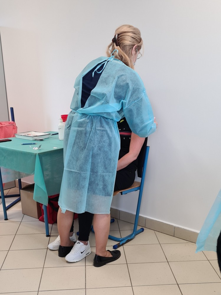 Na powyższym zdjęciu znajduje się burmistrz Beata Szczepankowska przy Punkcie Szczepień Powszechnych w Chorzelach.