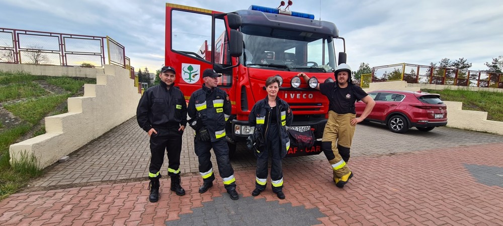 Na powyższym zdjęciu widoczny jest samochód strażacki oraz strażacy z OSP Budki zabezpieczający Punkt Szczepień w Chorzelach.