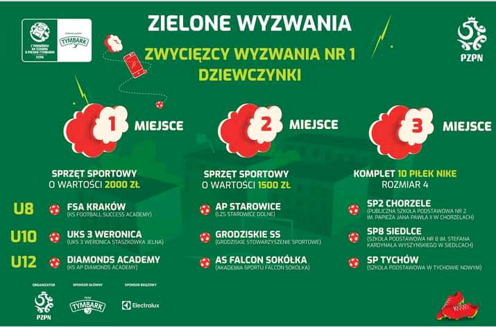 „Zielone Wyzwania” to piłkarskie zadania sprawdzające sportowe umiejętności i kreatywność. Rywalizacja w ramach „Zielonych Wyzwań” odbywała się w trzech kategoriach wiekowych: do lat 8, 10 oraz 12 – oddzielnie dla dziewcząt i chłopców. W pierwszych dekadach lutego, marca, kwietnia i maja Polski Związek Piłki Nożnej przedstawiał treści nowych wyzwań. Podczas całej akcji czekały nas łącznie cztery zadania. Każde z nich było dostosowane do sytuacji i obostrzeń aktualnie panujących w Polsce.