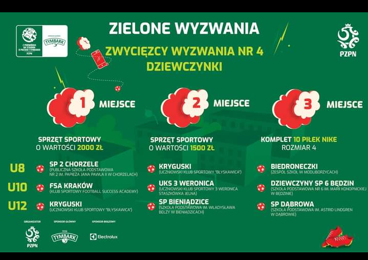 ,,Zielone Wyzwania” przyniosły wielki sukces uczennicom Publicznej Szkoły Podstawowej nr 2 im. Papieża Jana Pawła II w Chorzelach, które w czwartym wyzwaniu zdobyły I miejsce, tym samym zbywając główną nagrodę. Był nią wielki finał, czyli udział w treningu prowadzonym m.in. przez selekcjonerów i selekcjonerki młodzieżowych reprezentacji Polski. Dziewczęta zdobyły również dla całej społeczności szkolnej sprzęt sportowy do treningów piłki nożnej o wartości 2 000,00zł.