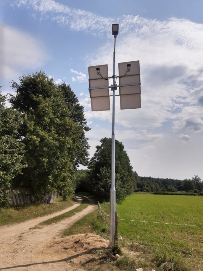 Zakres prac obejmował: montaż i postawienie na fundamencie umieszczonym w wykopie ziemnym słupa oświetleniowego, montaż mocowania solara, wysięgnika oraz oprawy LED 35W, montaż 2 sztuk baterii słonecznych, montaż skrzynki na akumulator oraz 2 sztuk żelowych akumulatorów 12V wraz z niezbędnym kontrolerem ładowania i osprzętem odgromowym. Wykonawcą inwestycji była firma KAJZER Usługi Elektryczno - Remontowe Cezary Goś z Przasnysza.