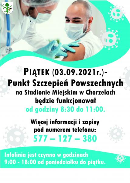 Piątek (03.09.2021 r.) - Punkt Szczepień Powszechnych na Stadionie Miejskim w Chorzelach będzie funkcjonował od godziny 8:30 do 11:00.