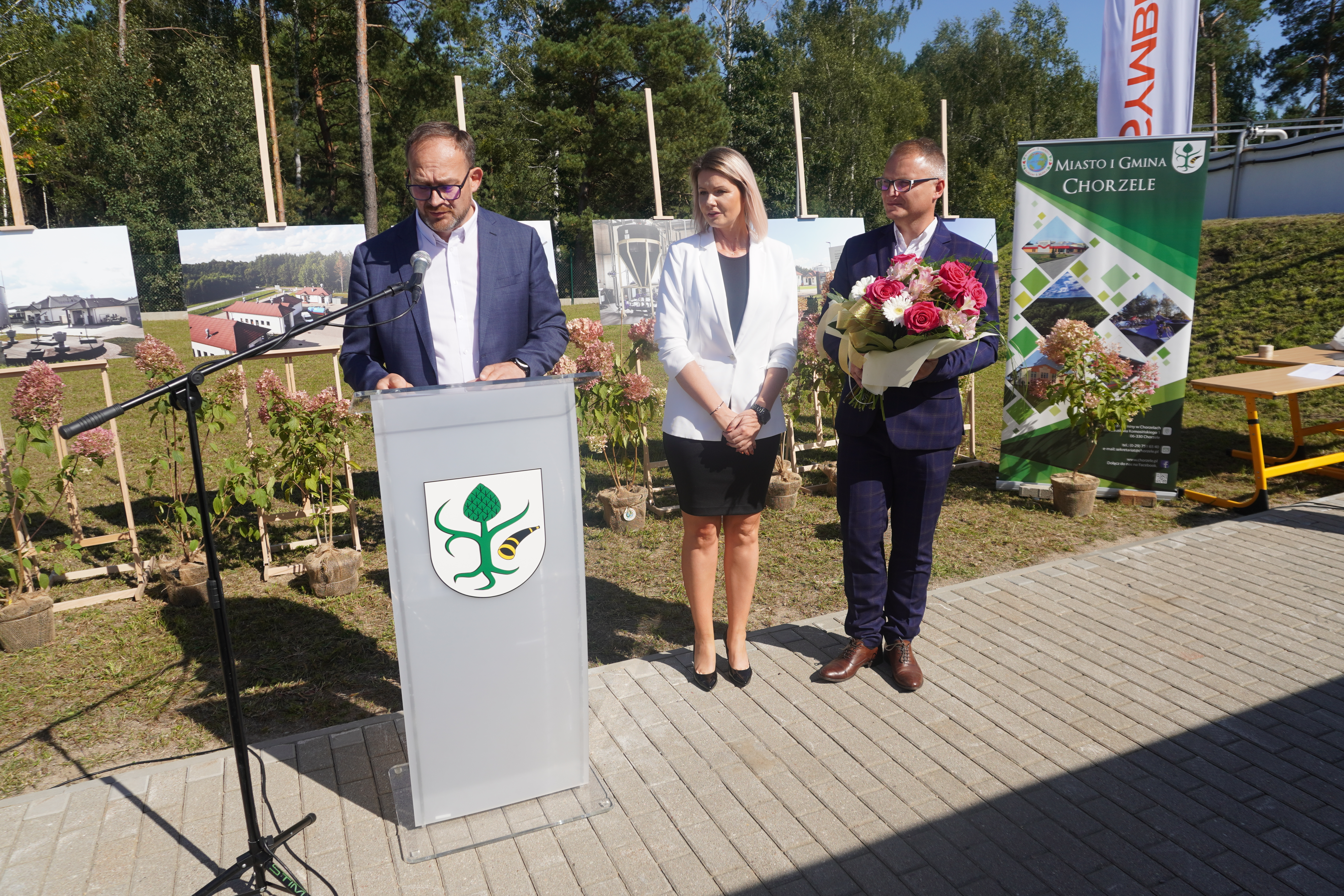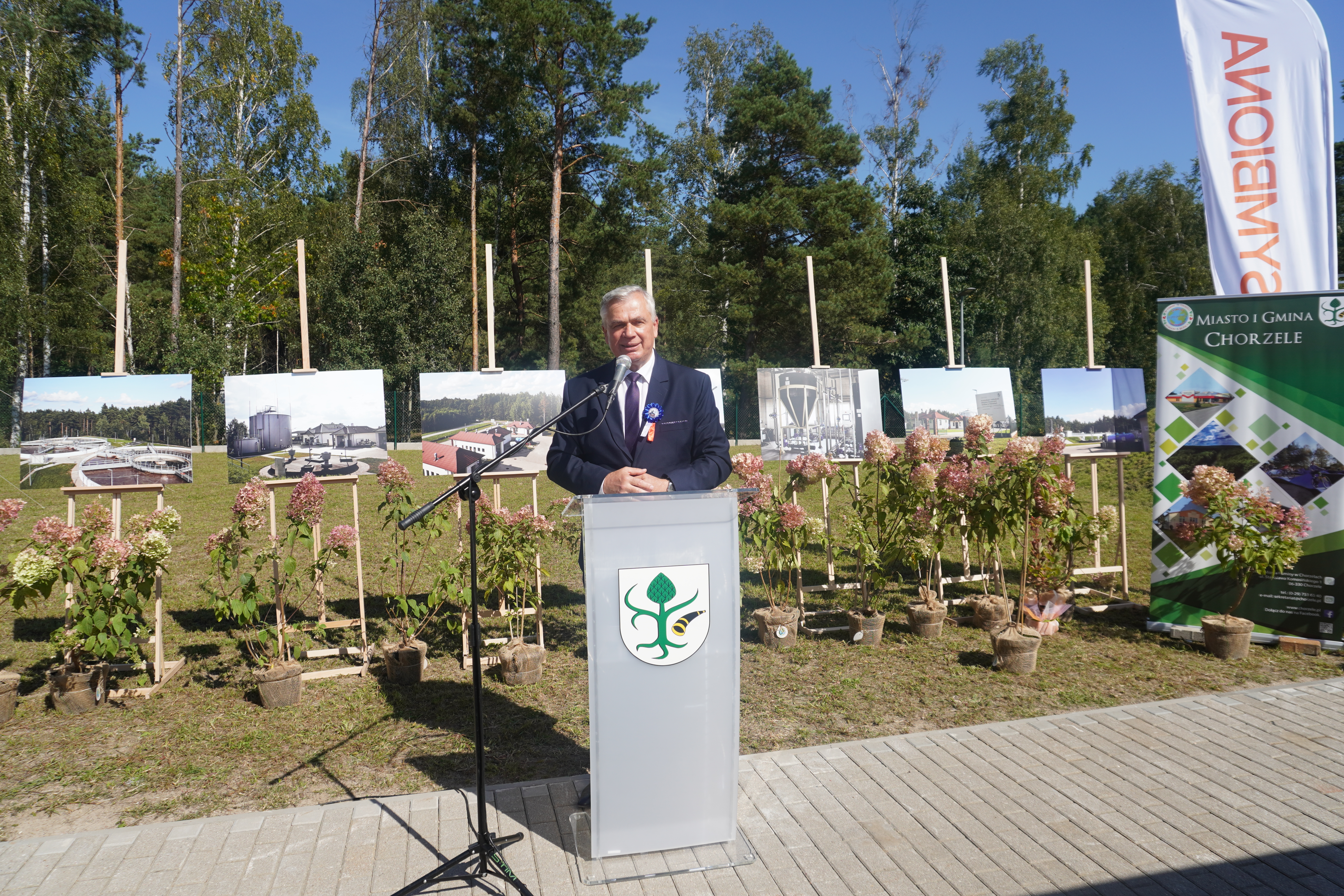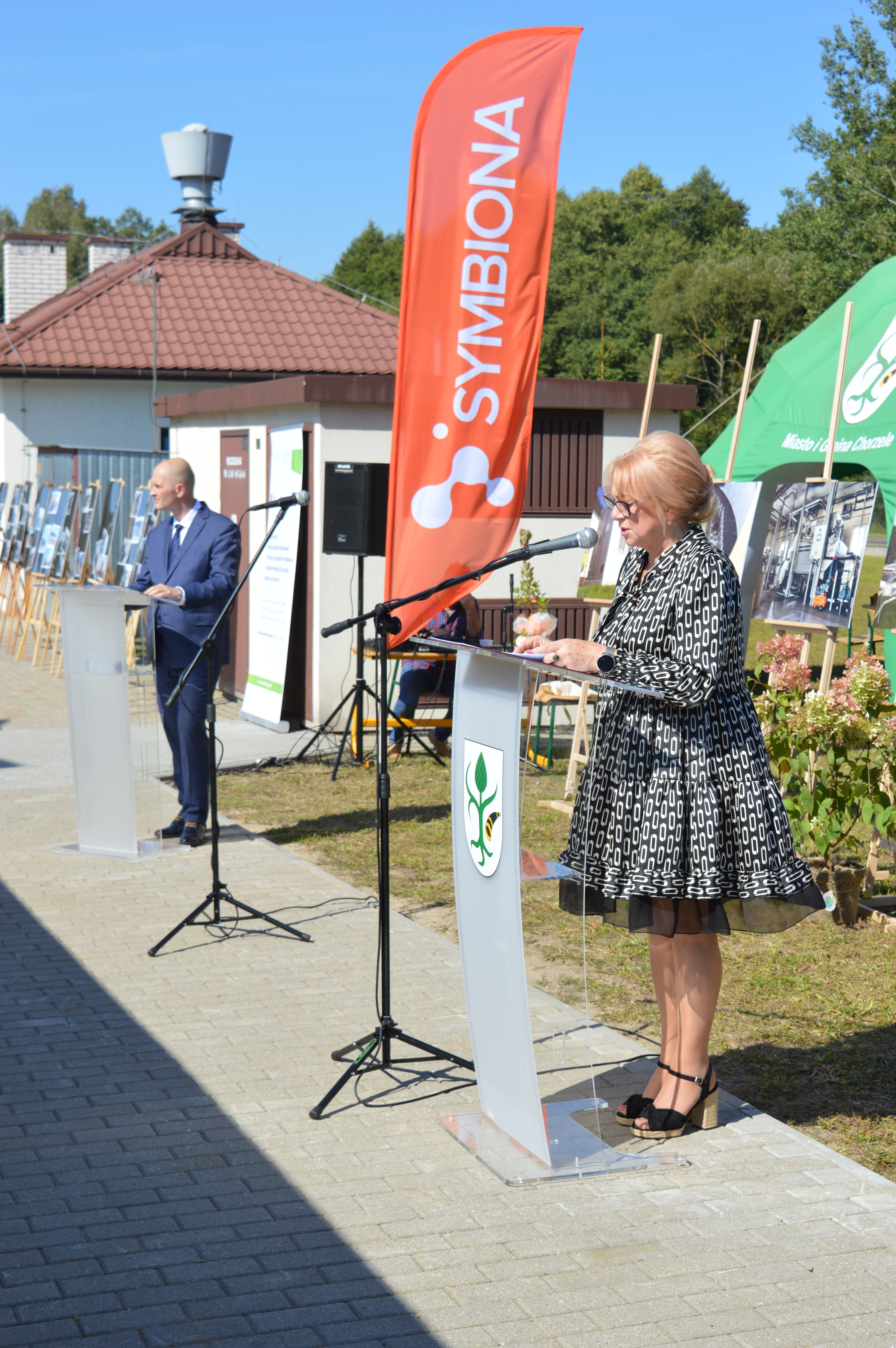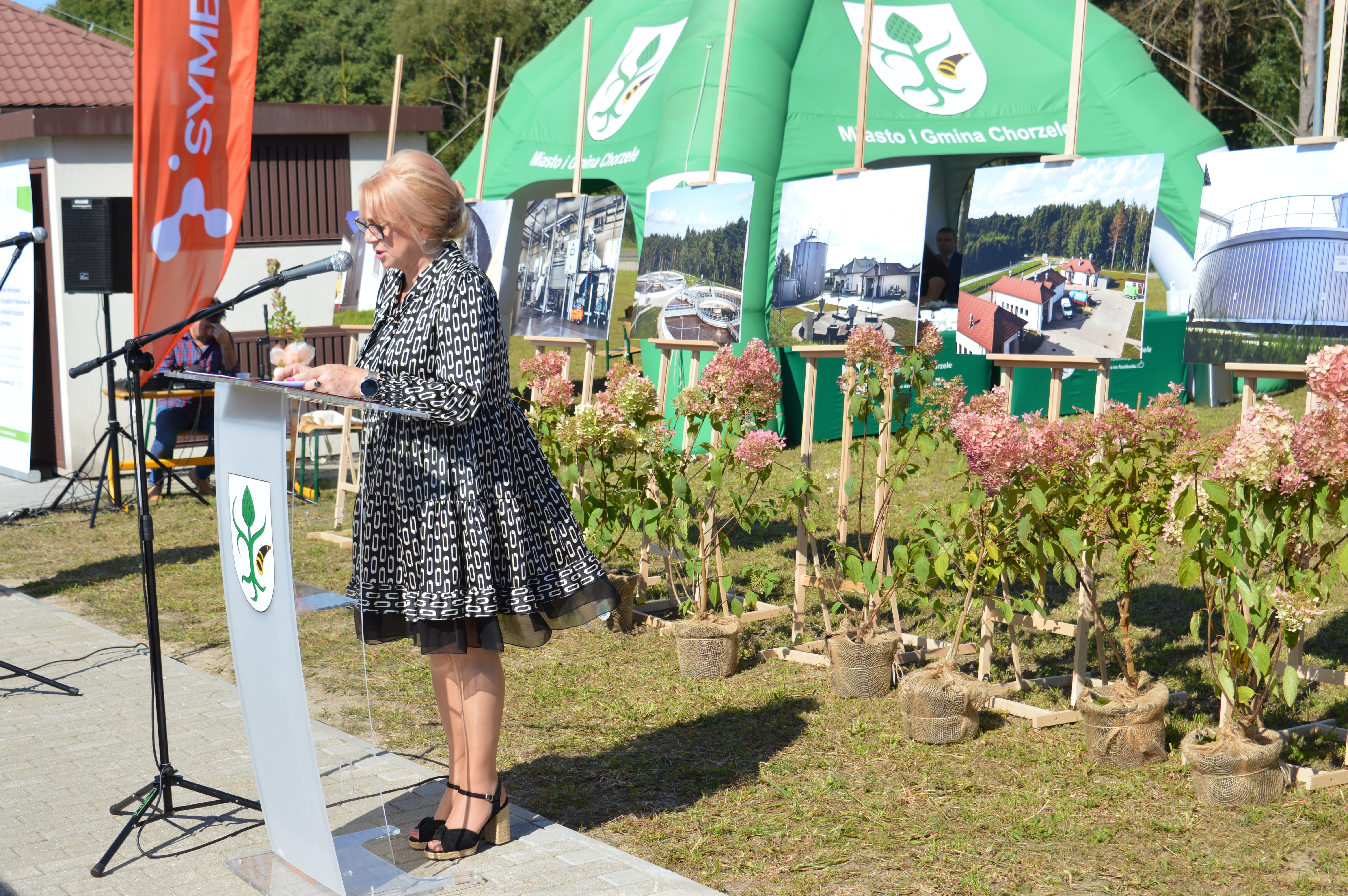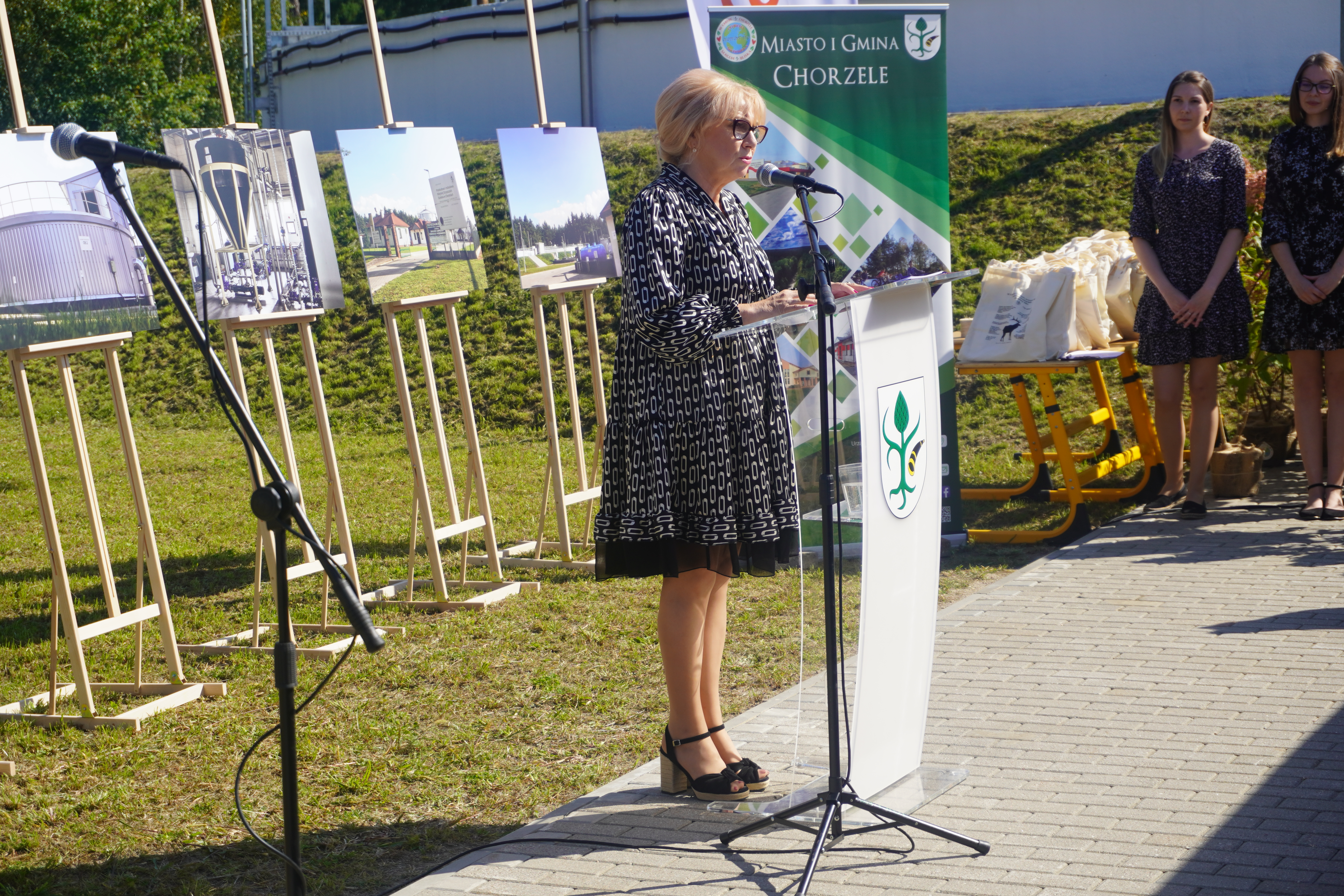 - Witam Państwa w imieniu własnym i Wykonawcy bardzo serdecznie, w tym uroczystym i bardzo ważnym dla naszej całej społeczności dniu - na terenie Przebudowanej i Rozbudowanej Miejskiej Oczyszczalni Ścieków w Chorzelach, w dniu, w którym nasz trud i wysiłek włożony w realizację tego niezwykle istotnego przedsięwzięcia zakończył się sukcesem. Obiekt ma pozwolenie na użytkowanie, pozwolenie wodnoprawne, spełnia wszelkie wymagania stawiane przez ochronę środowiska w Polsce, jak i Unię Europejską. Sukces ten nie byłby możliwy, gdyby nie pomoc i zaangażowanie wszystkich Państwa, których pragnę z całego serca powitać i podziękować – rozpoczęła swoje wystąpienie burmistrz Beata Szczepankowska, która w ciekawej konwencji, witając gości, przybliżała ich wkład w inwestycję i dziękowała wręczając wyjątkowe, ekologiczne upominki w postaci pięknych drzewek.