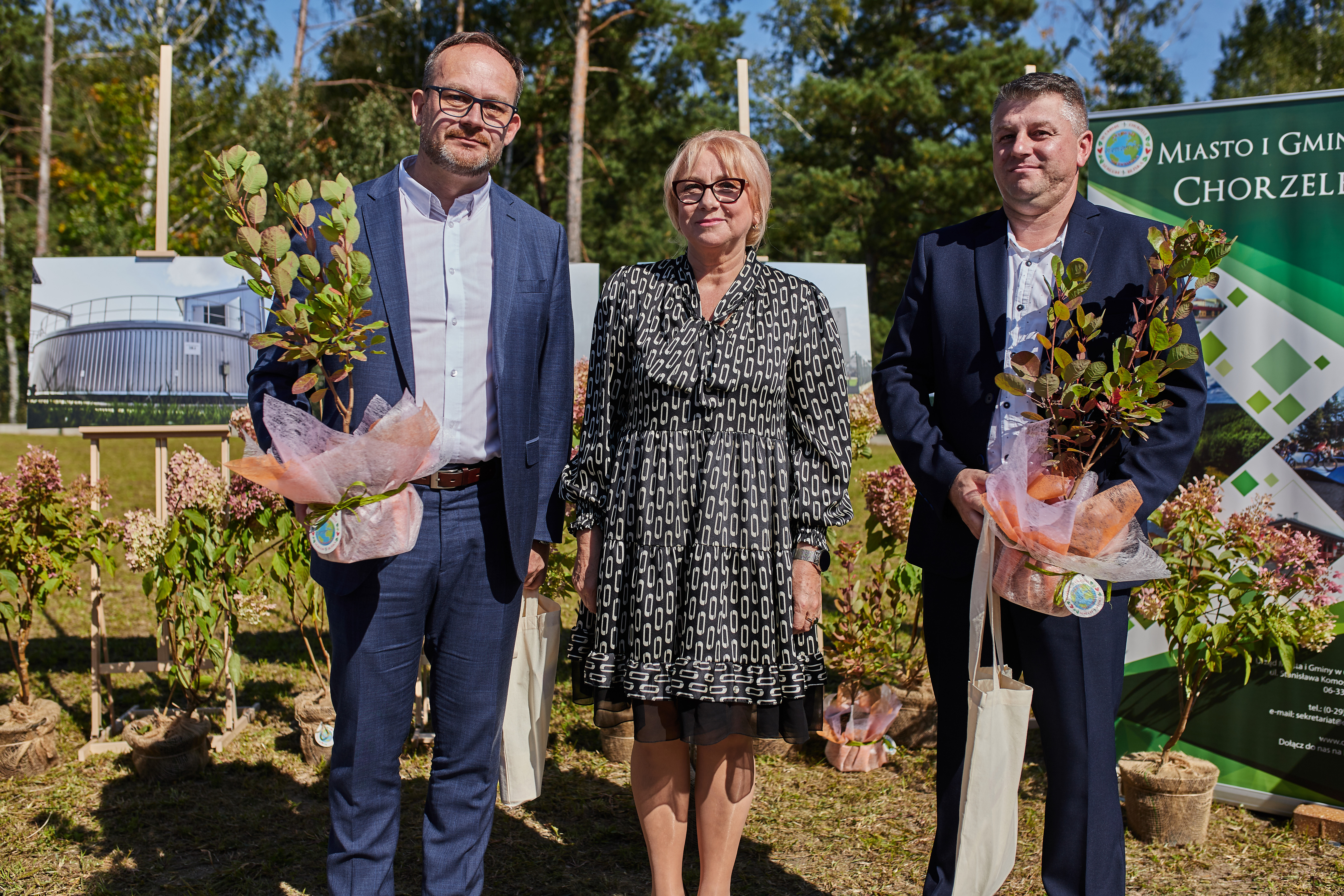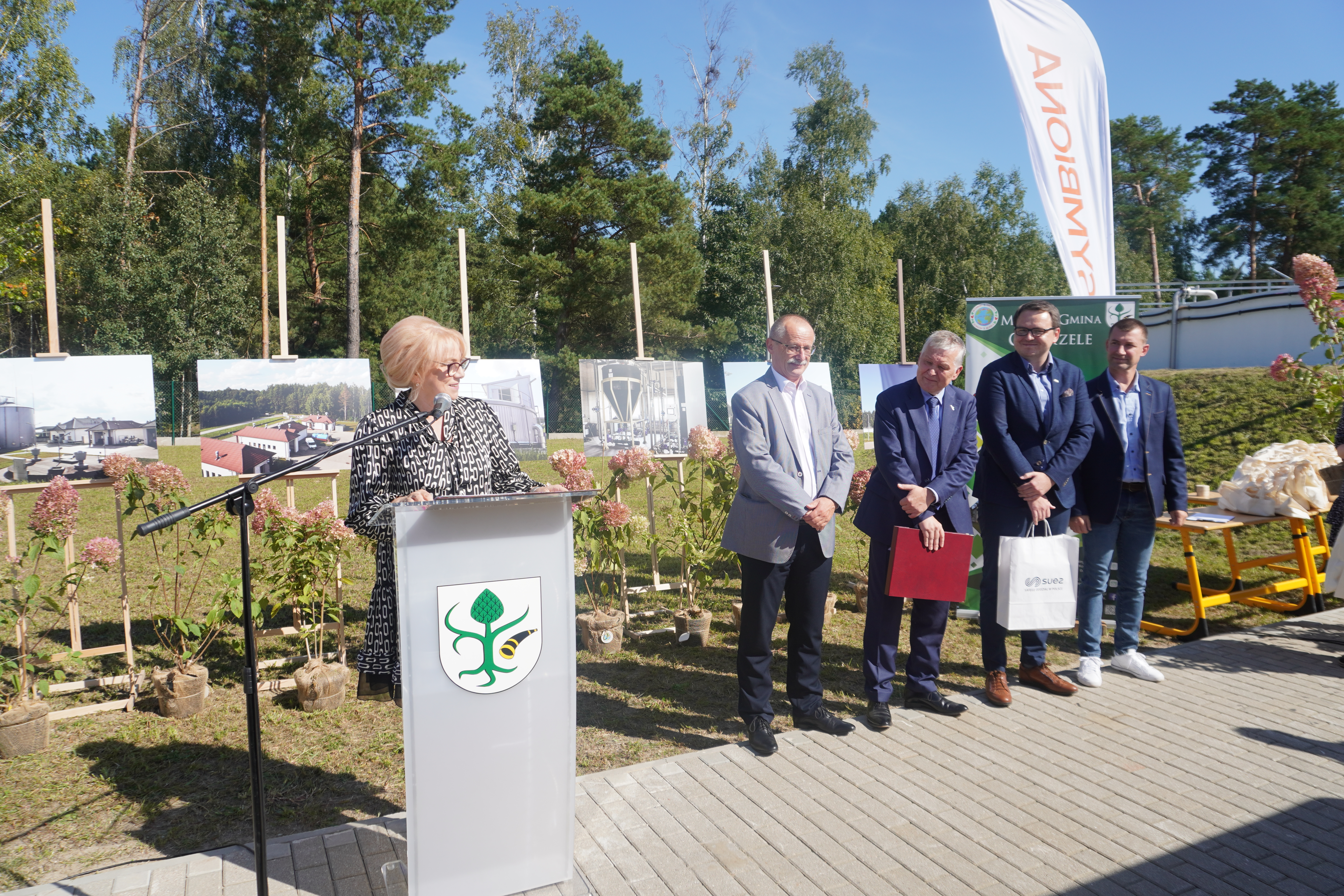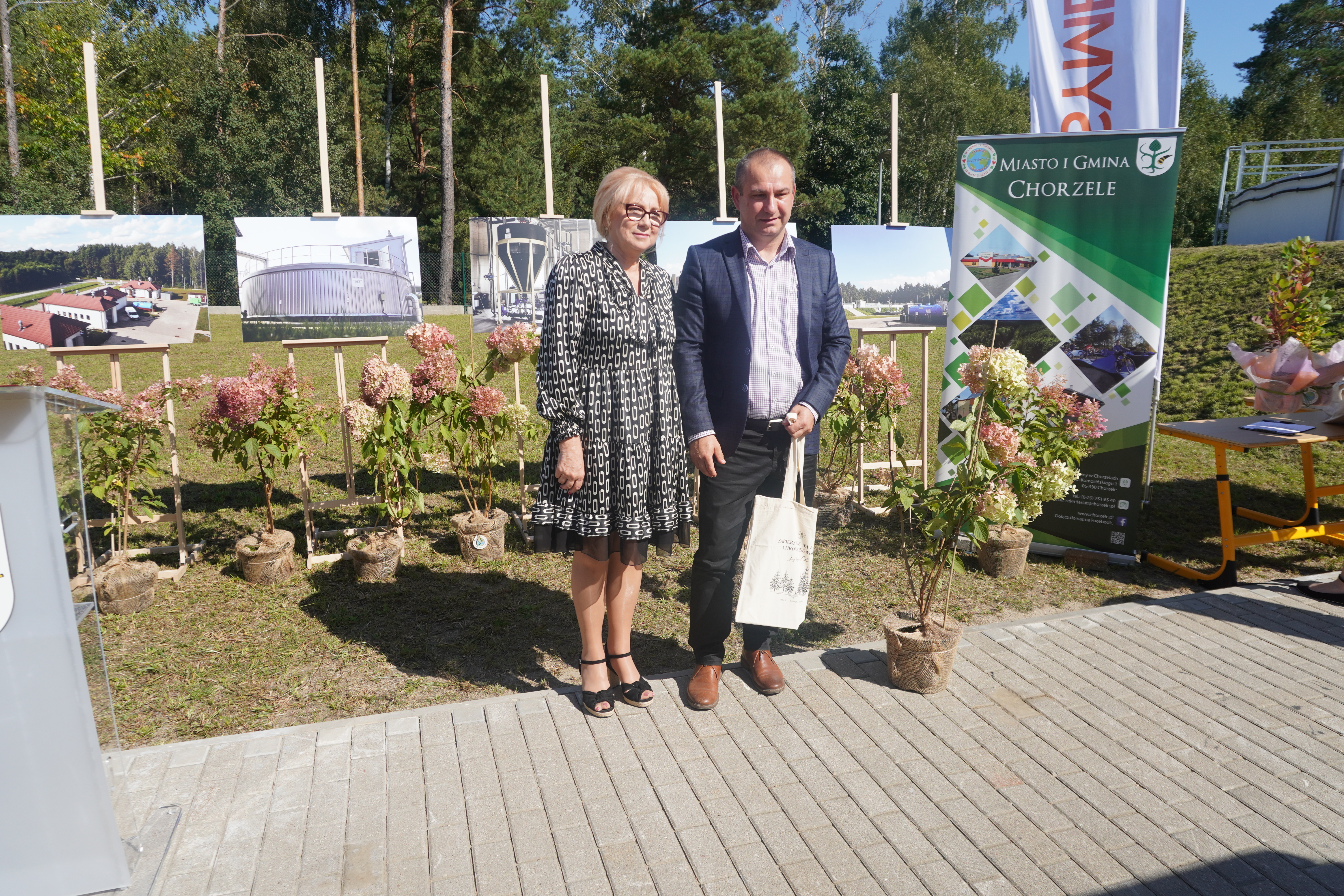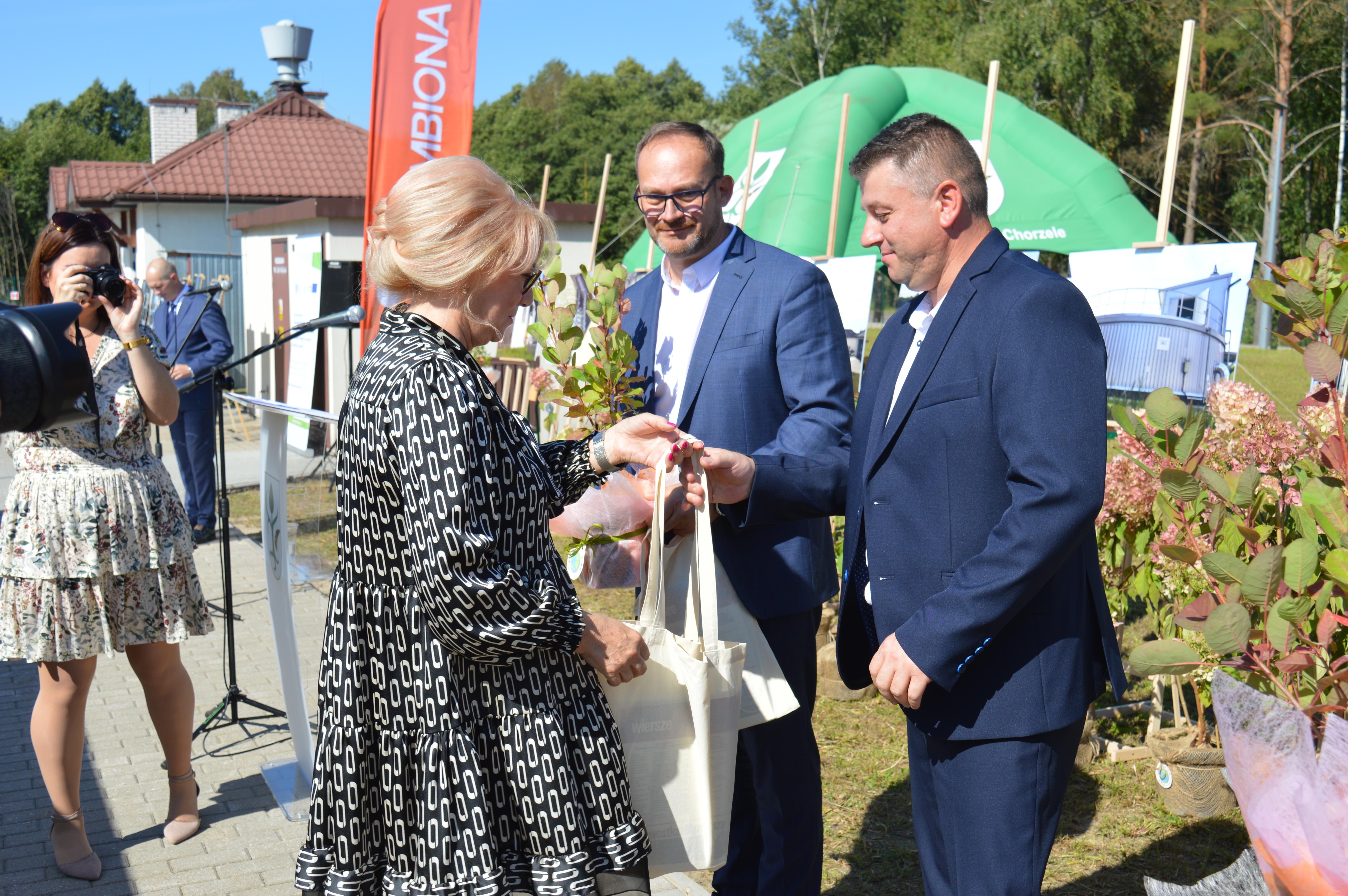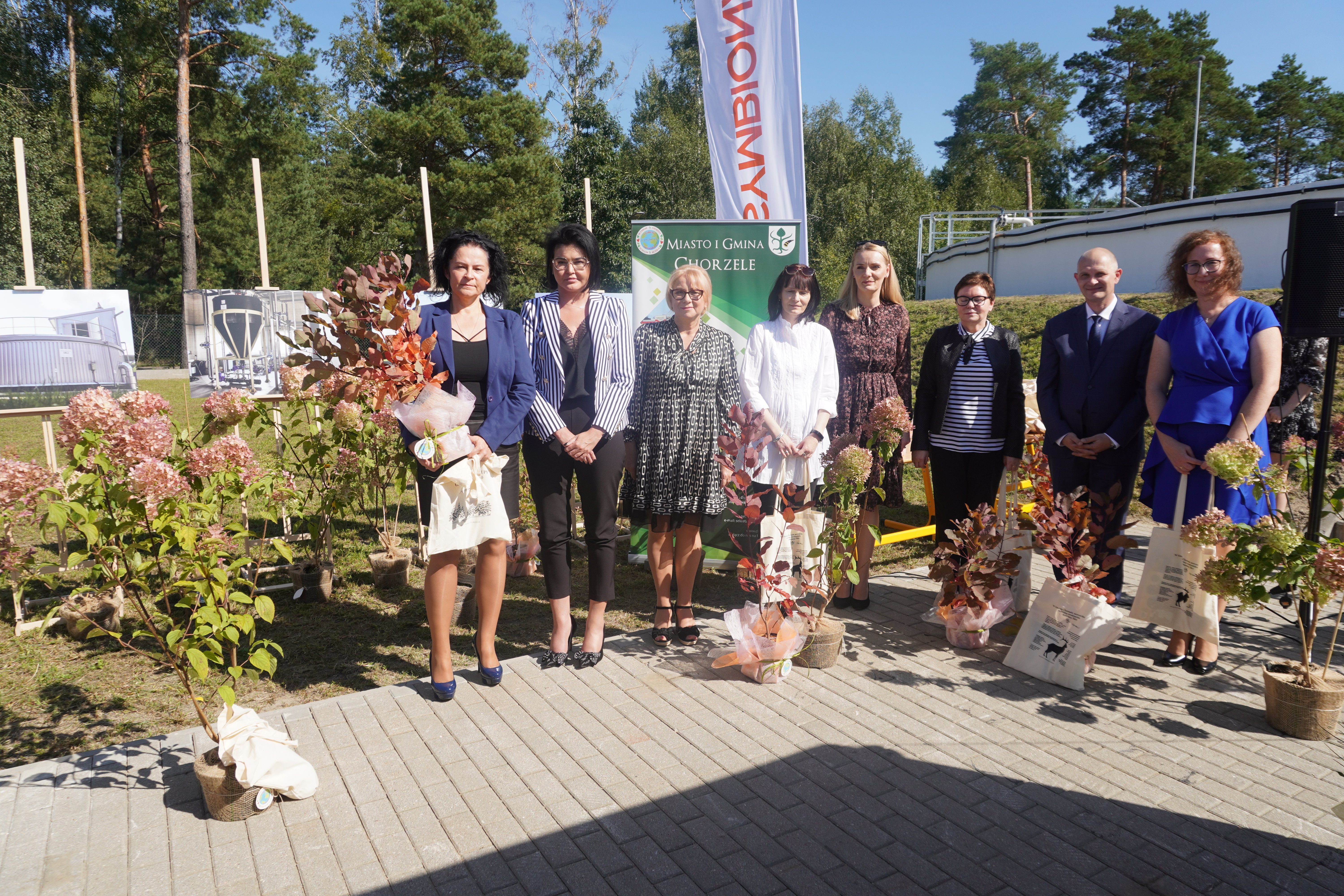 - Witam Państwa w imieniu własnym i Wykonawcy bardzo serdecznie, w tym uroczystym i bardzo ważnym dla naszej całej społeczności dniu - na terenie Przebudowanej i Rozbudowanej Miejskiej Oczyszczalni Ścieków w Chorzelach, w dniu, w którym nasz trud i wysiłek włożony w realizację tego niezwykle istotnego przedsięwzięcia zakończył się sukcesem. Obiekt ma pozwolenie na użytkowanie, pozwolenie wodnoprawne, spełnia wszelkie wymagania stawiane przez ochronę środowiska w Polsce, jak i Unię Europejską. Sukces ten nie byłby możliwy, gdyby nie pomoc i zaangażowanie wszystkich Państwa, których pragnę z całego serca powitać i podziękować – rozpoczęła swoje wystąpienie burmistrz Beata Szczepankowska, która w ciekawej konwencji, witając gości, przybliżała ich wkład w inwestycję i dziękowała wręczając wyjątkowe, ekologiczne upominki w postaci pięknych drzewek.