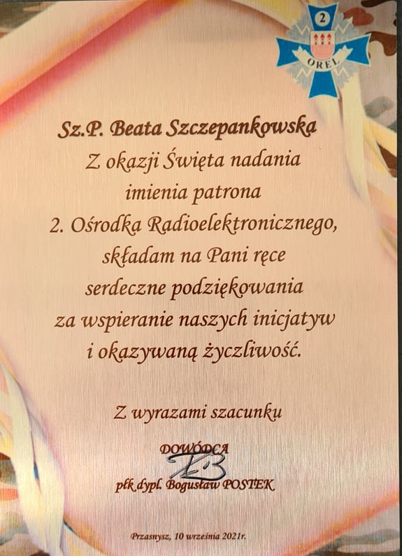 Podczas zbiórki Dowódca 2. Ośrodka Radioelektronicznego płk dypl. Bogusław Postek wręczył również podziękowania dla burmistrz Beaty Szczepankowskiej za wspieranie inicjatyw Ośrodka oraz okazaną życzliwość.