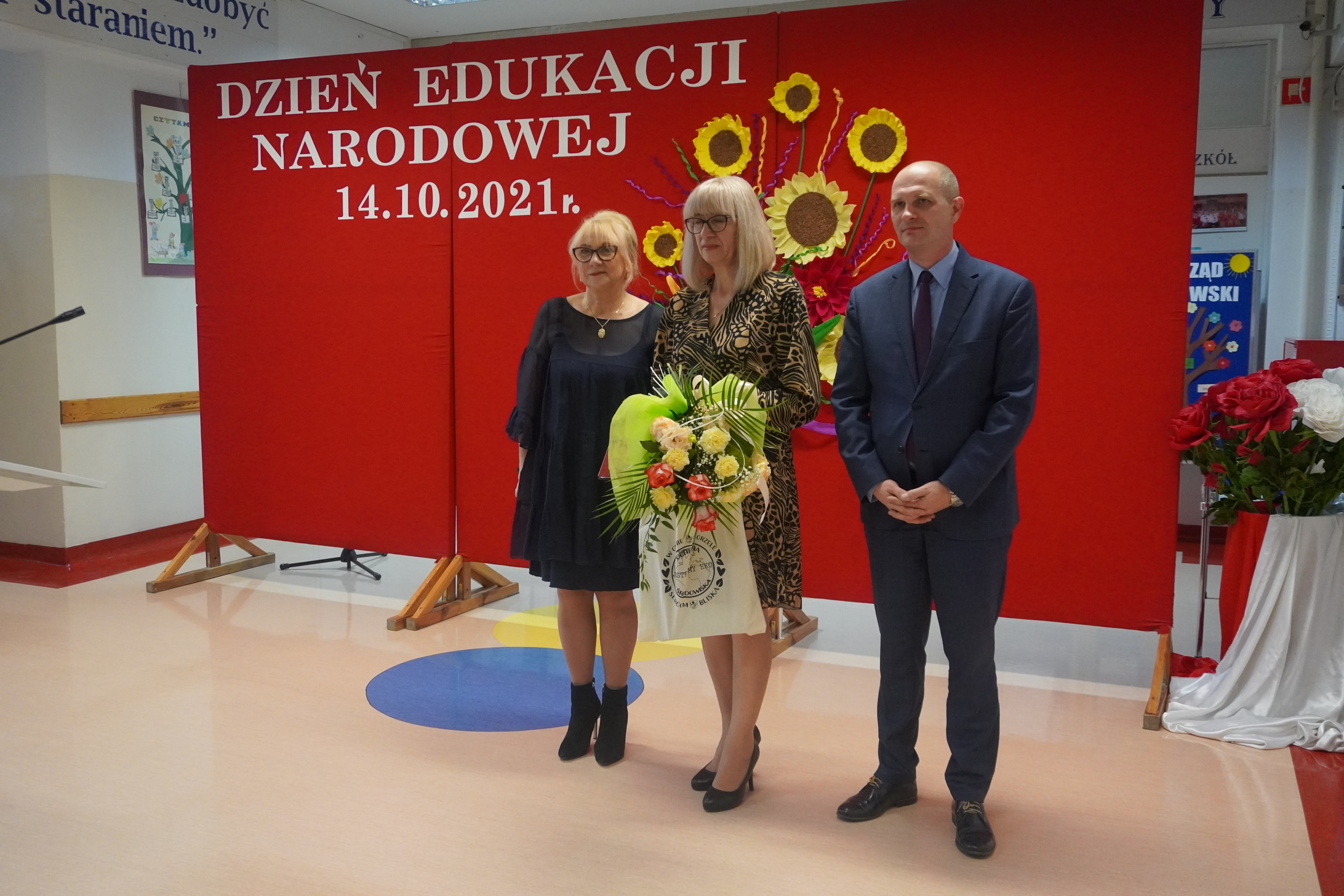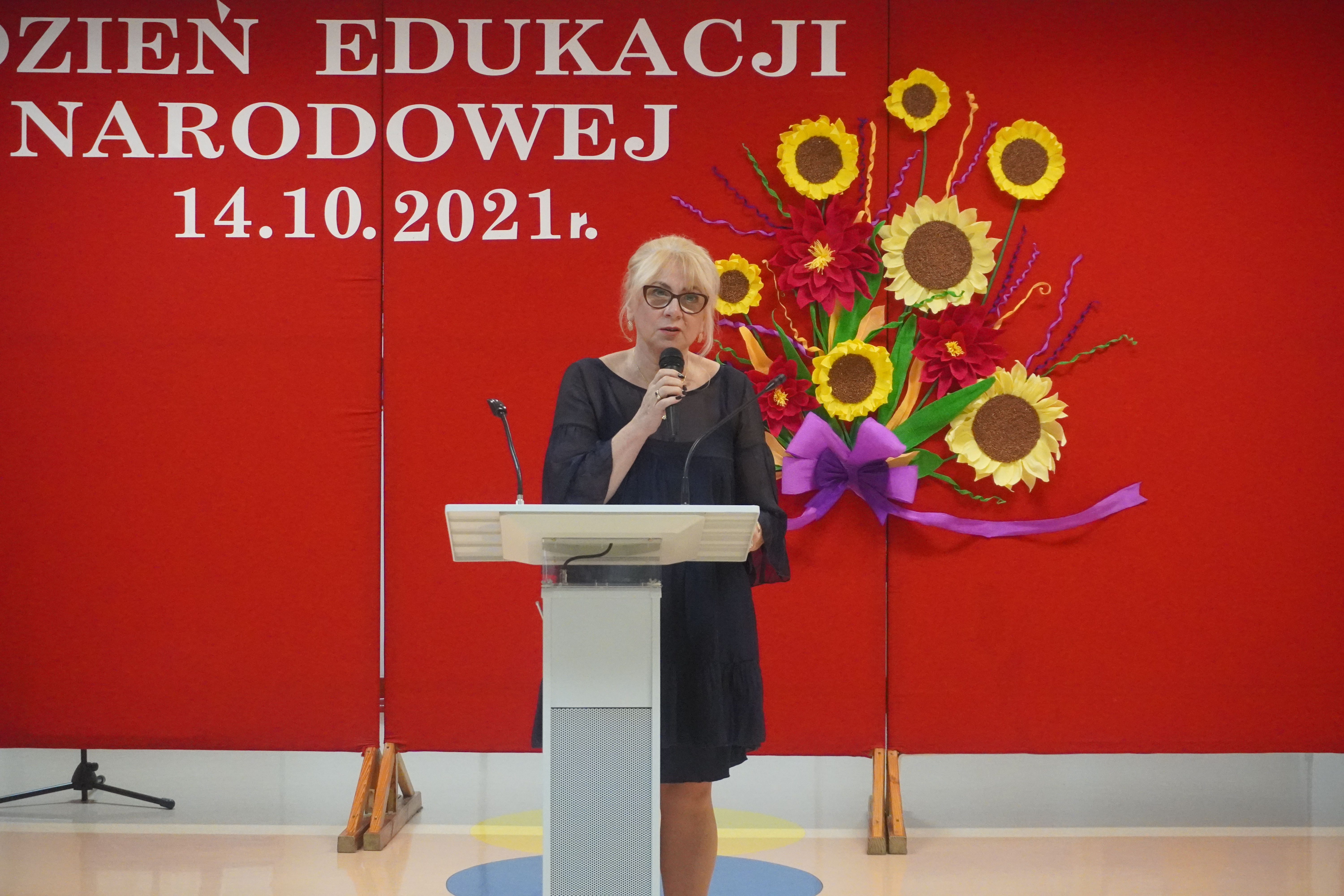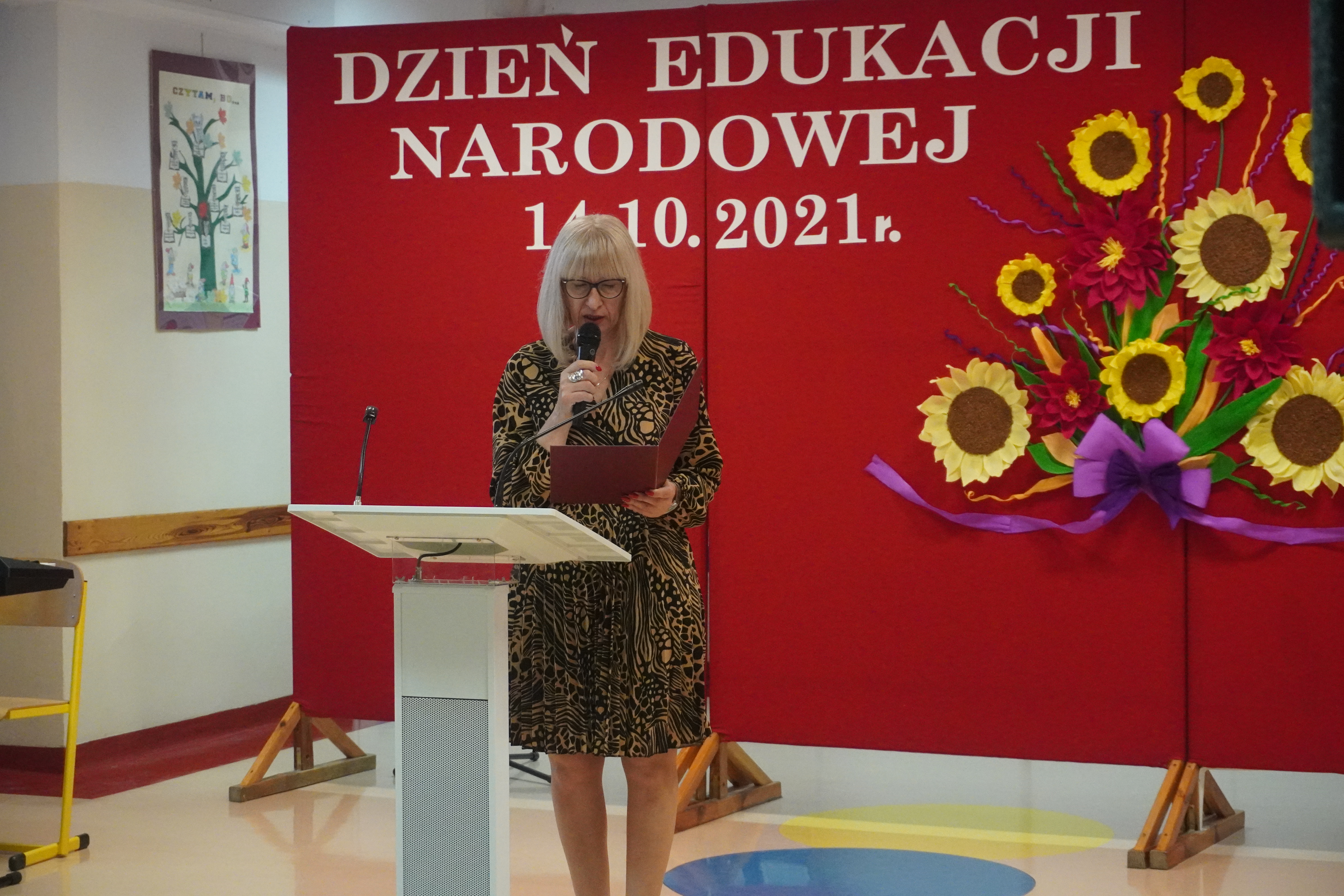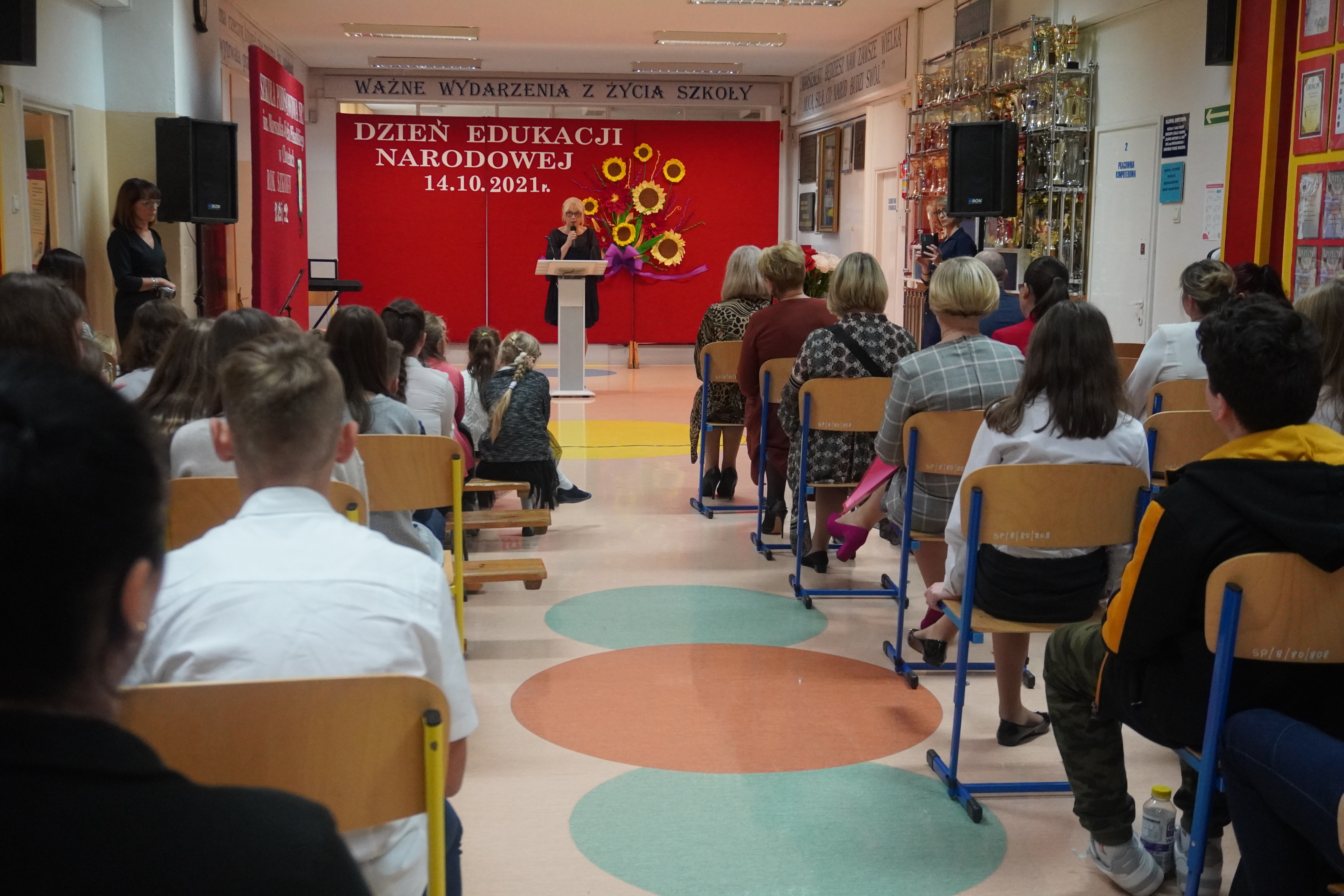 P o. dyrektora szkoły Pani Anna Ossowska powitała przybyłych gości, pracowników szkoły oraz uczniów i rodziców. Do nauczycieli, pracowników administracji i obsługi skierowała serdeczne życzenia z okazji ich święta, pogratulowała osiągnięć i wręczyła nagrody.
