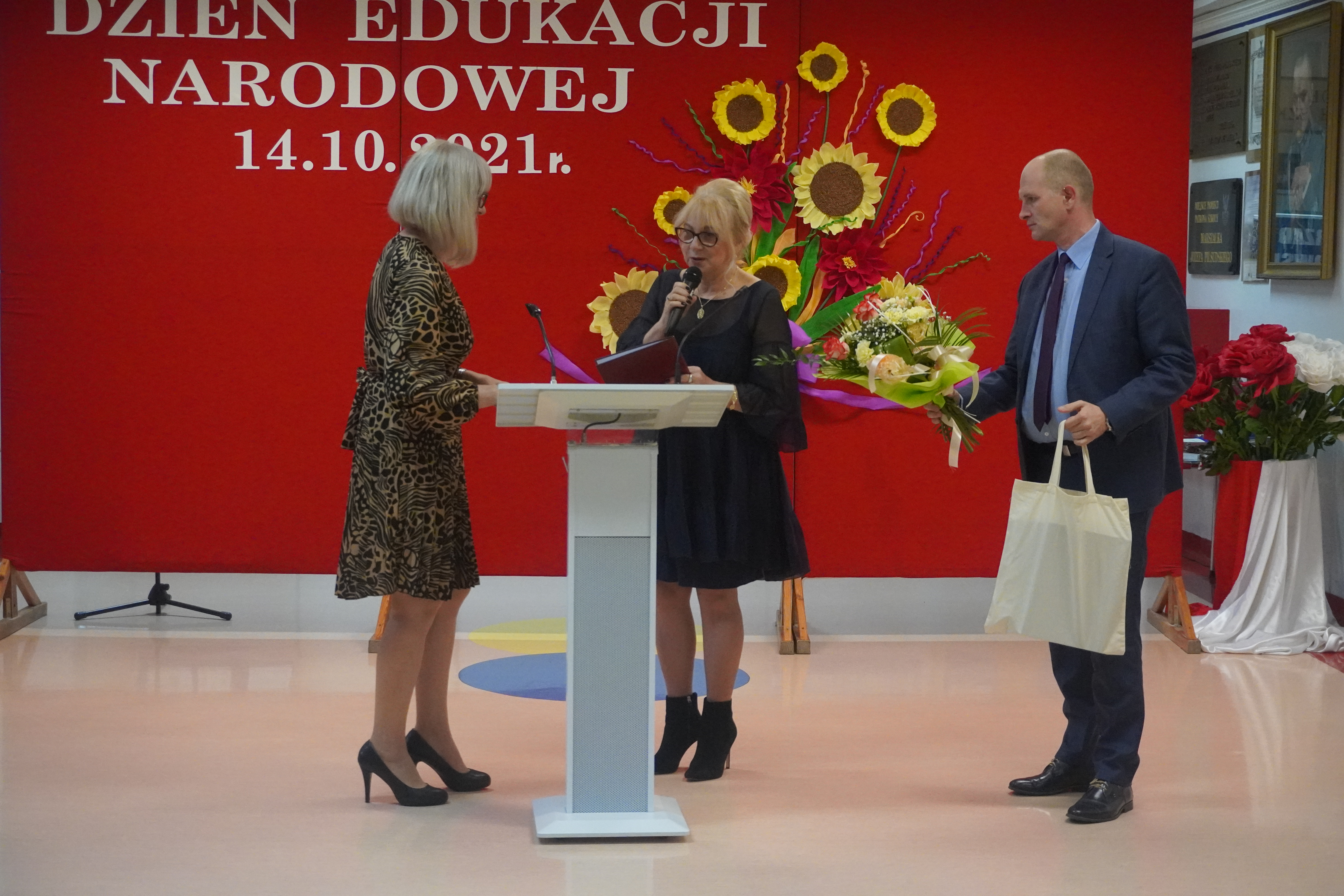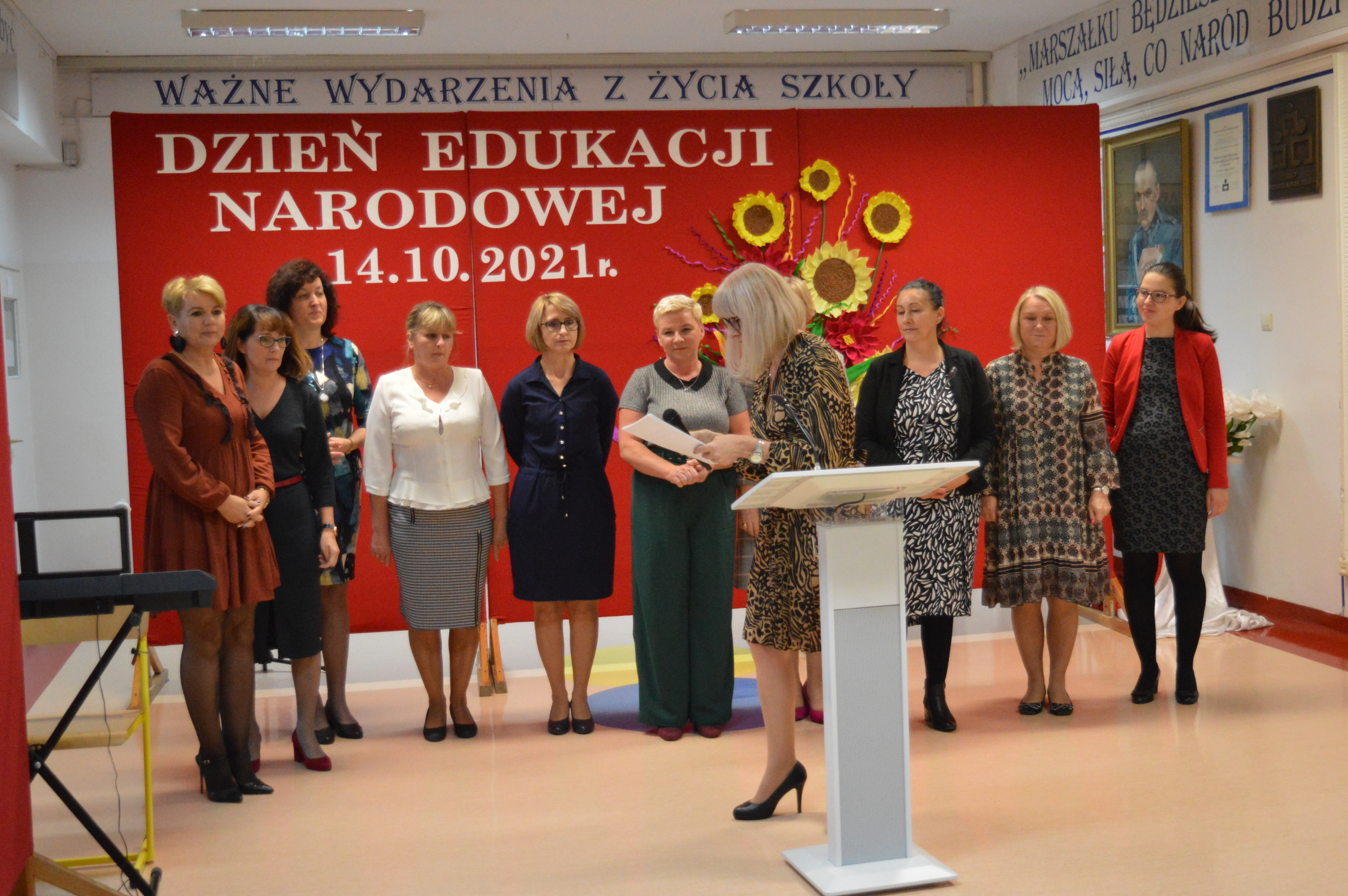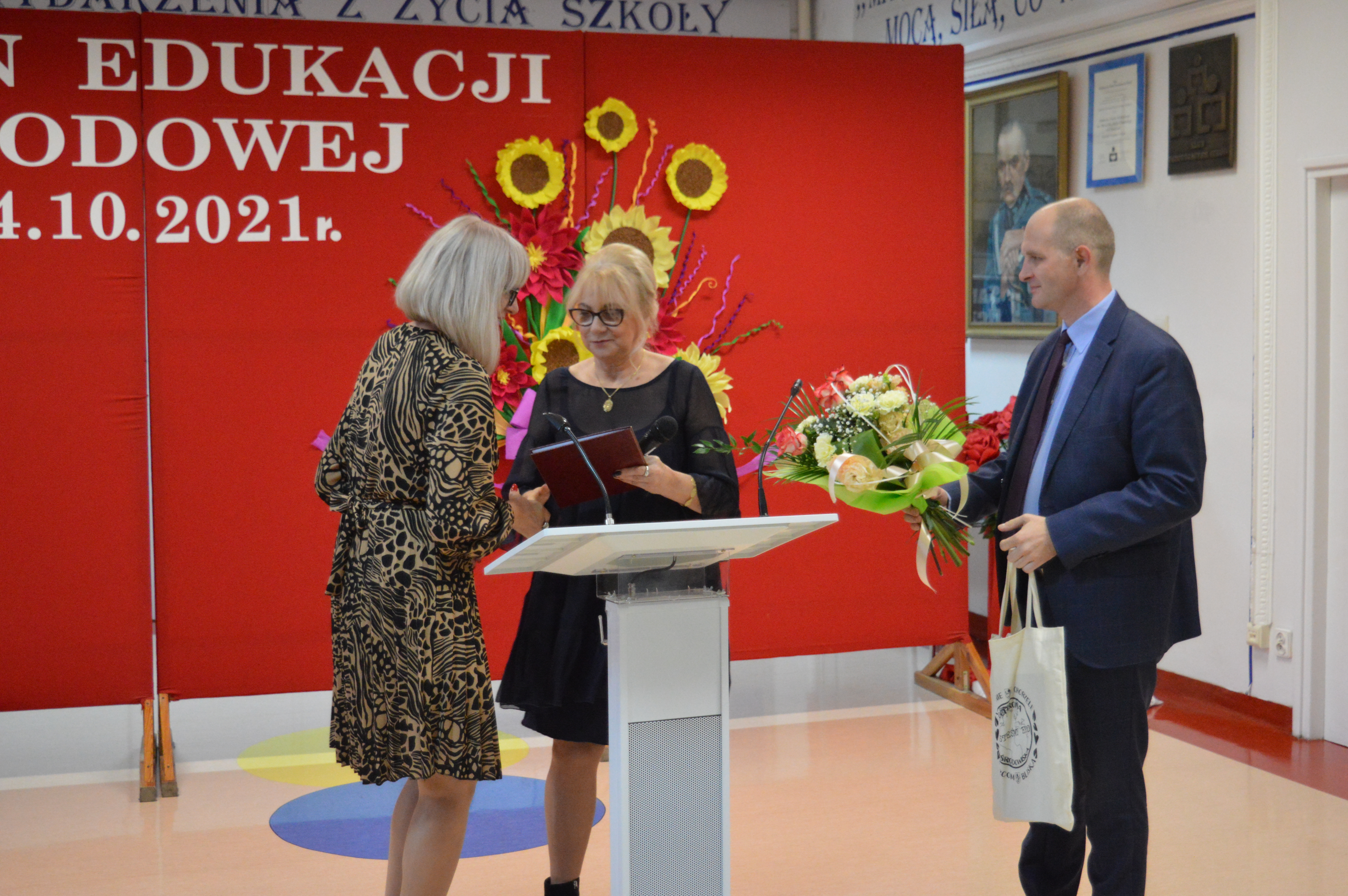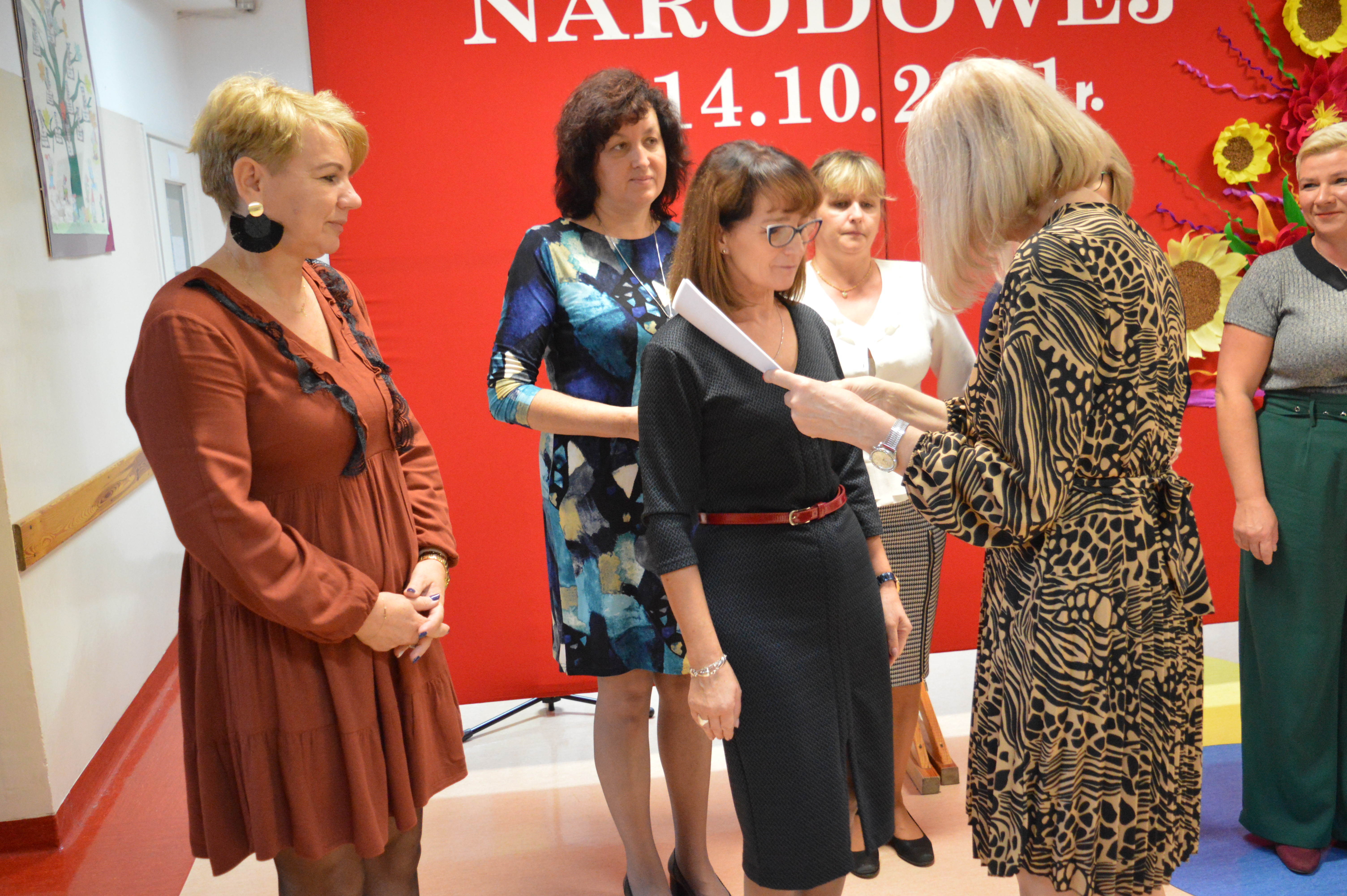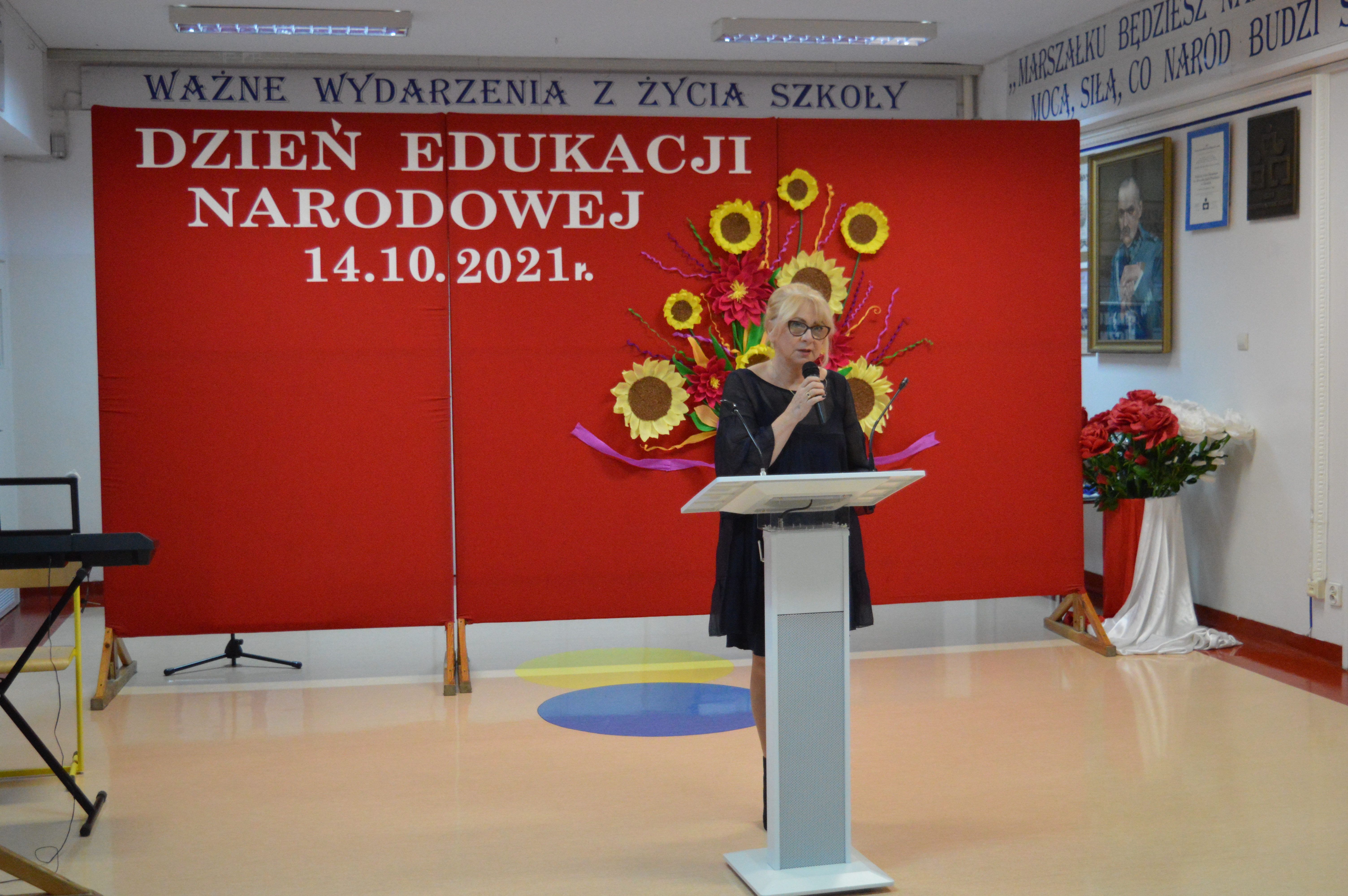 P o. dyrektora szkoły Pani Anna Ossowska powitała przybyłych gości, pracowników szkoły oraz uczniów i rodziców. Do nauczycieli, pracowników administracji i obsługi skierowała serdeczne życzenia z okazji ich święta, pogratulowała osiągnięć i wręczyła nagrody.