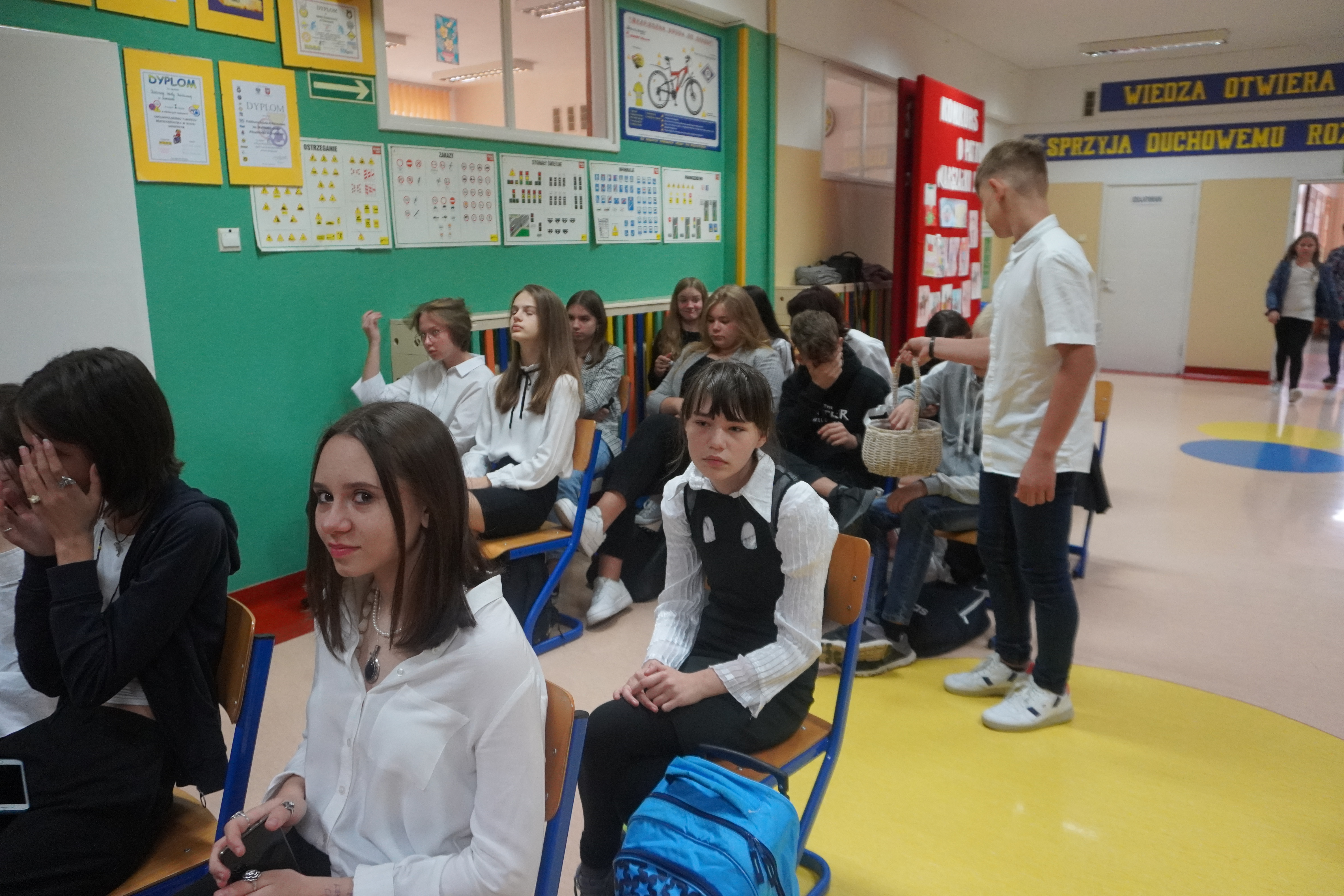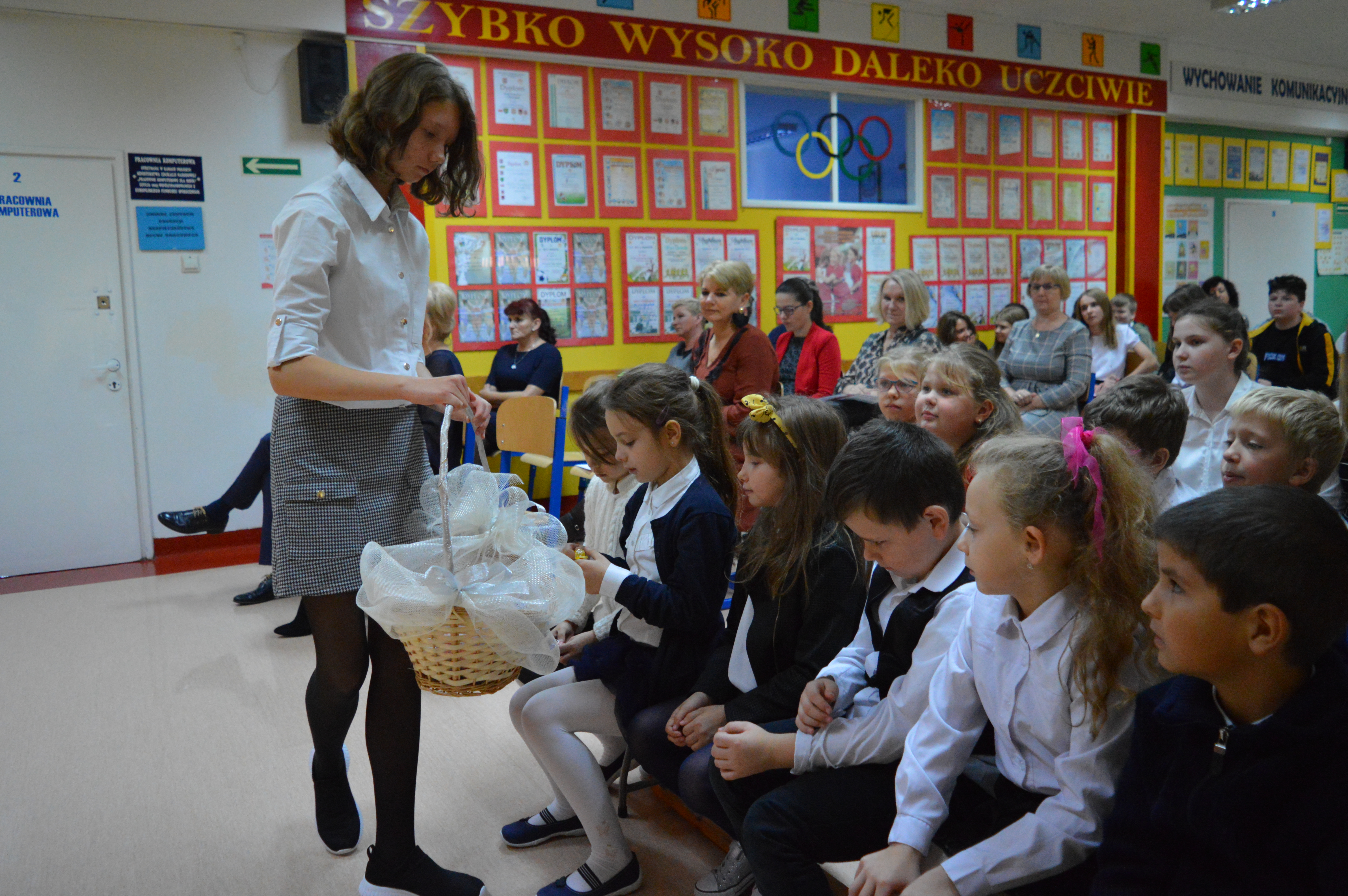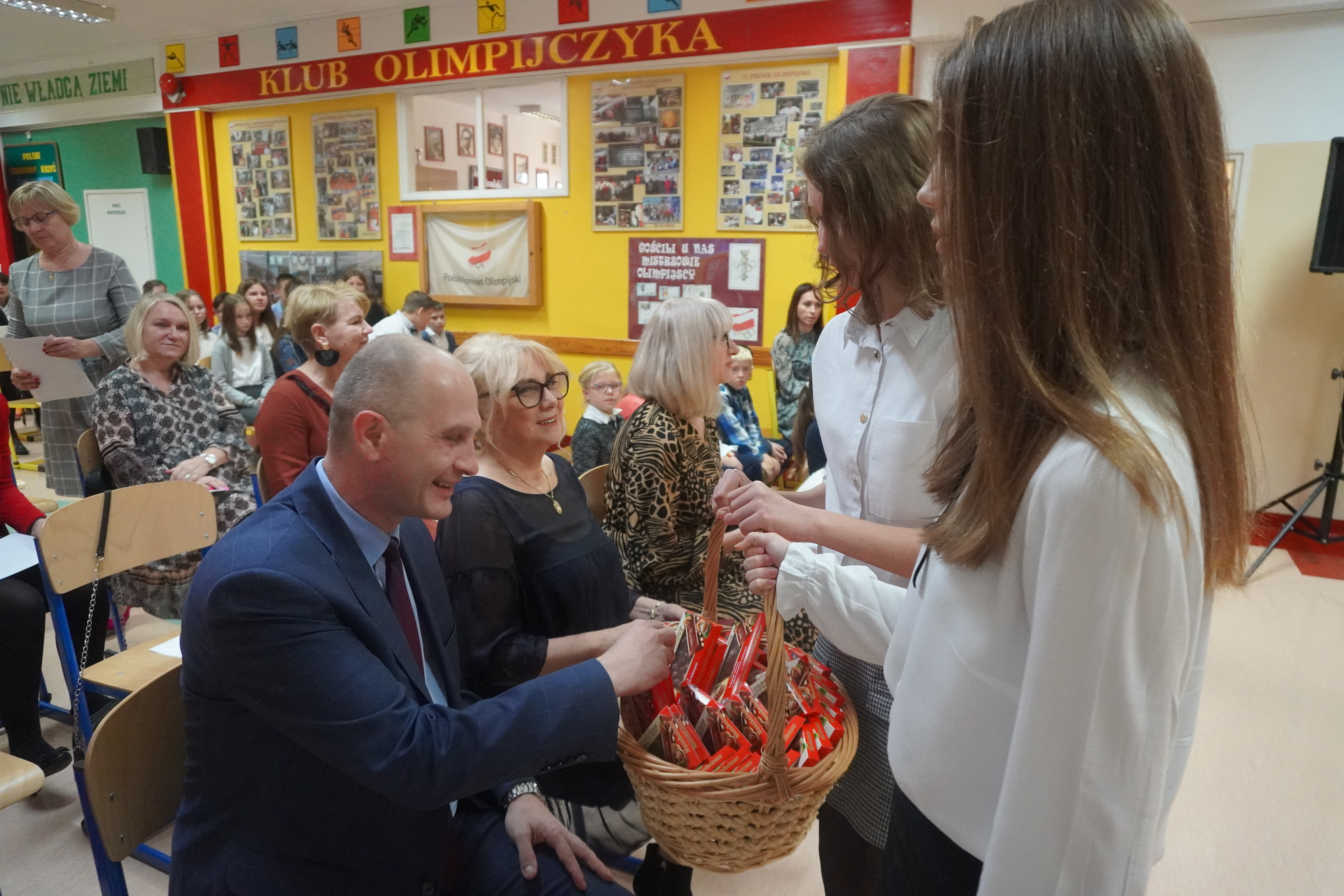 Burmistrz złożyła życzenia również wszystkim uczniom i przekazała słodkie upominki.