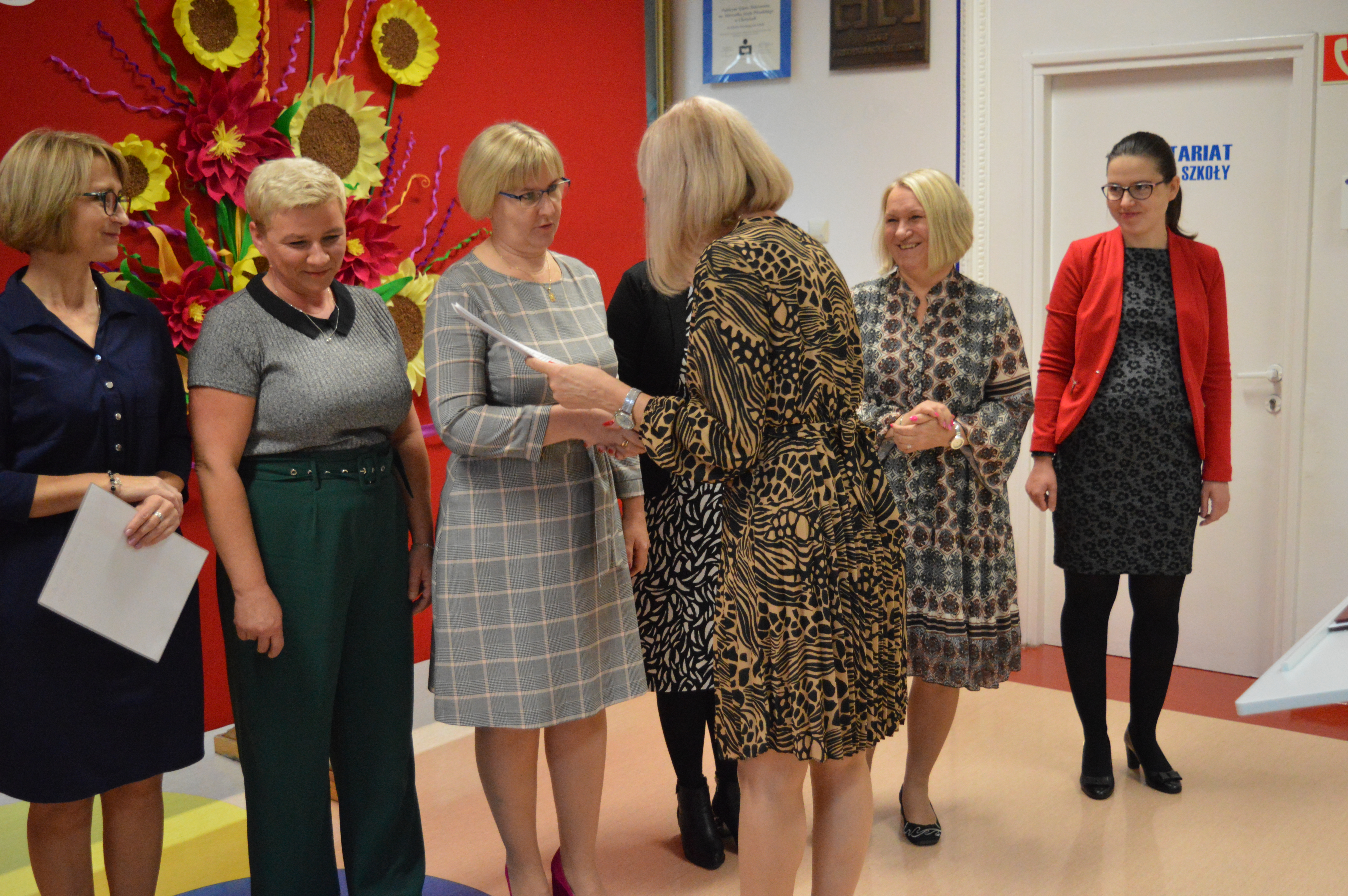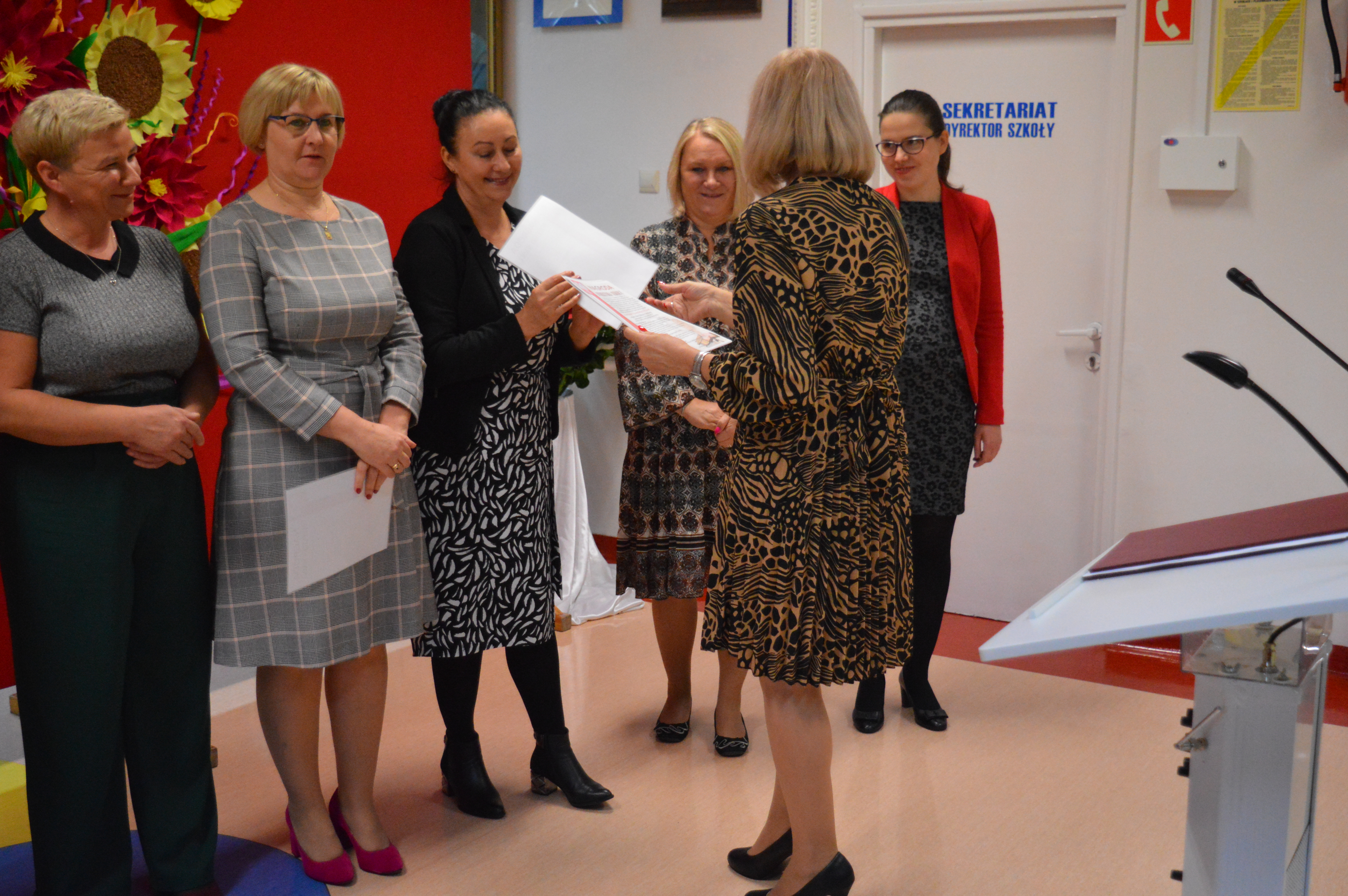 Słowa podziękowania składam także Pracownikom administracji i obsługi, dziękując za wkład wnoszony w życie szkoły. Państwa praca jest może mniej zauważalna dla dzieci, ale jakże ważna do realizacji zadań szkoły. W czystej, ukwieconej, zadbanej szkole uczniowie i nauczyciele czują się dowartościowani i uszanowani.” – mówiła Burmistrz Beata Szczepankowska.