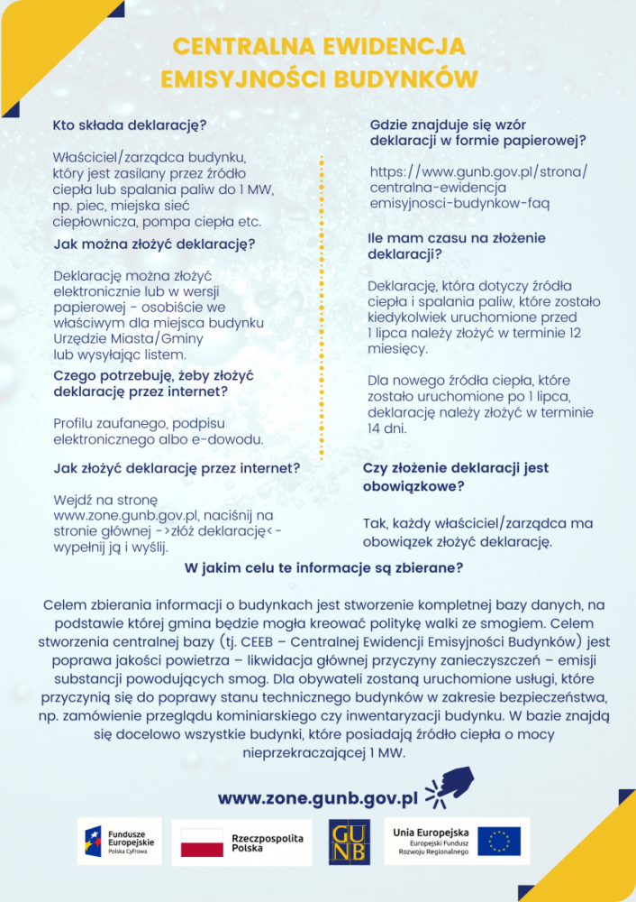 przypominamy, że od 1 lipca 2021 roku trwa obowiązkowe składanie deklaracji do Centralnej Ewidencji Emisyjności Budynków dotyczące źródeł ciepła i spalania paliw w budynkach mieszkalnych oraz niemieszkalnych. Poniżej zamieszczamy informacje w jaki sposób można złożyć deklarację oraz w jakim terminie należy to zrobić.