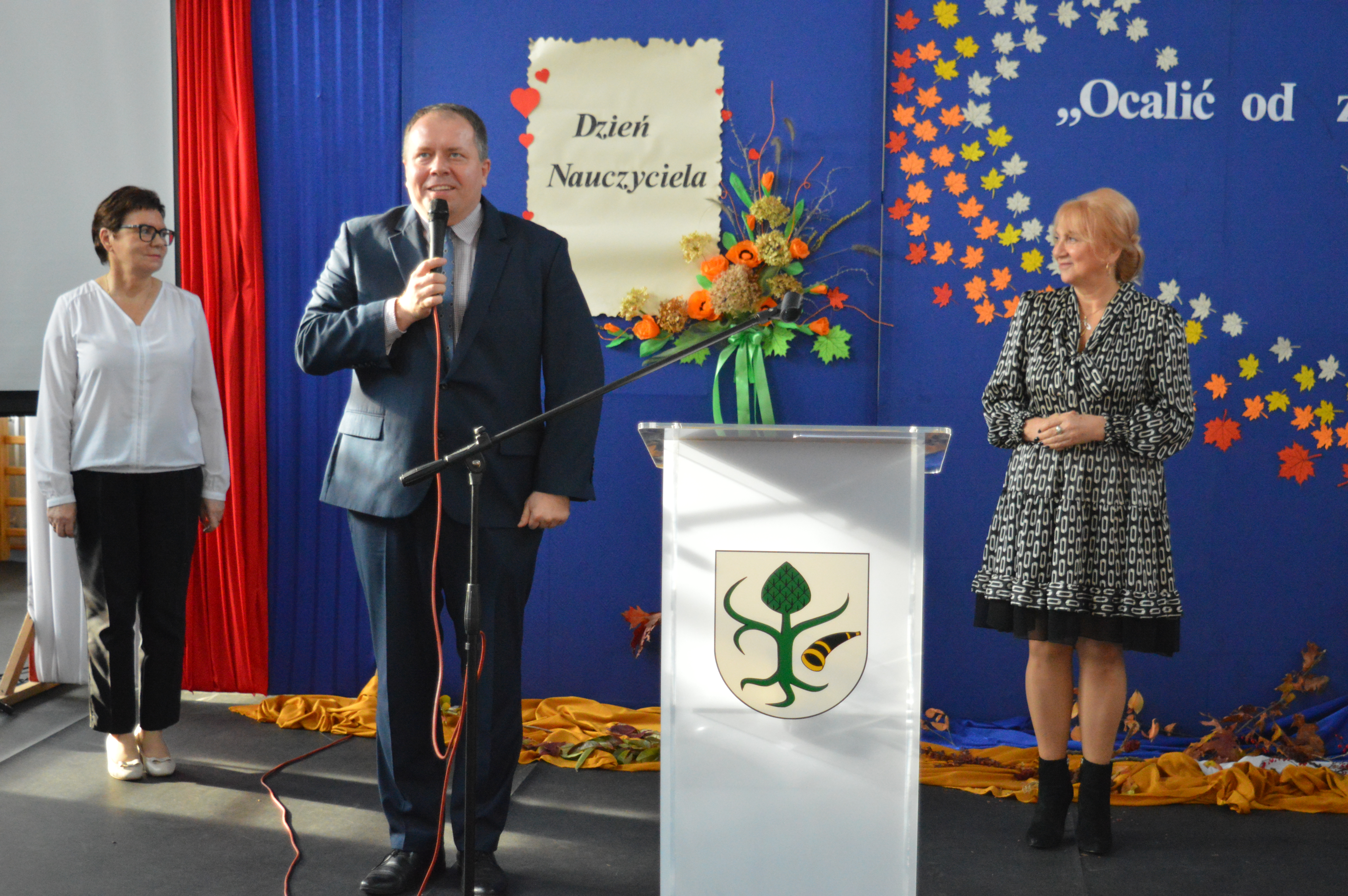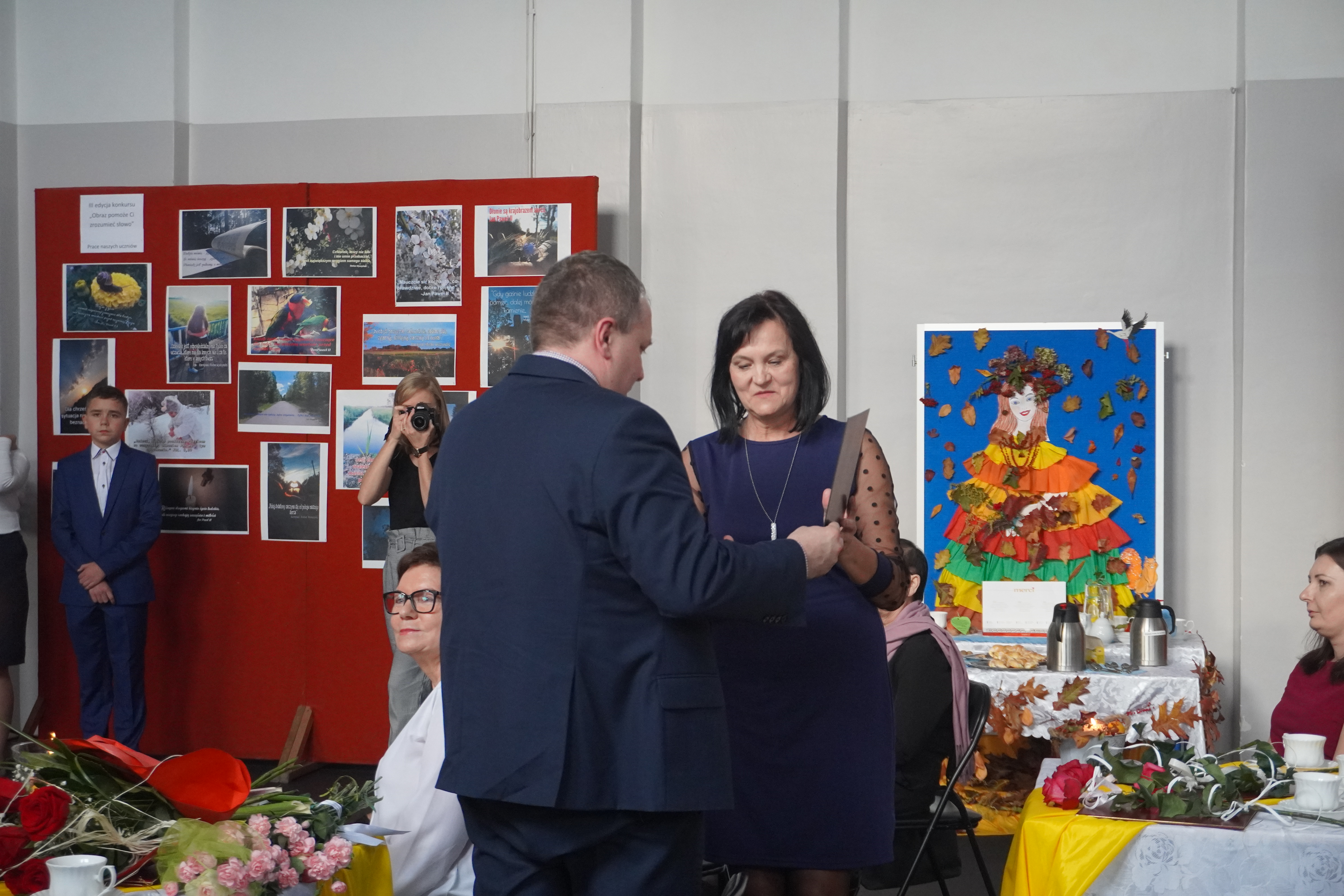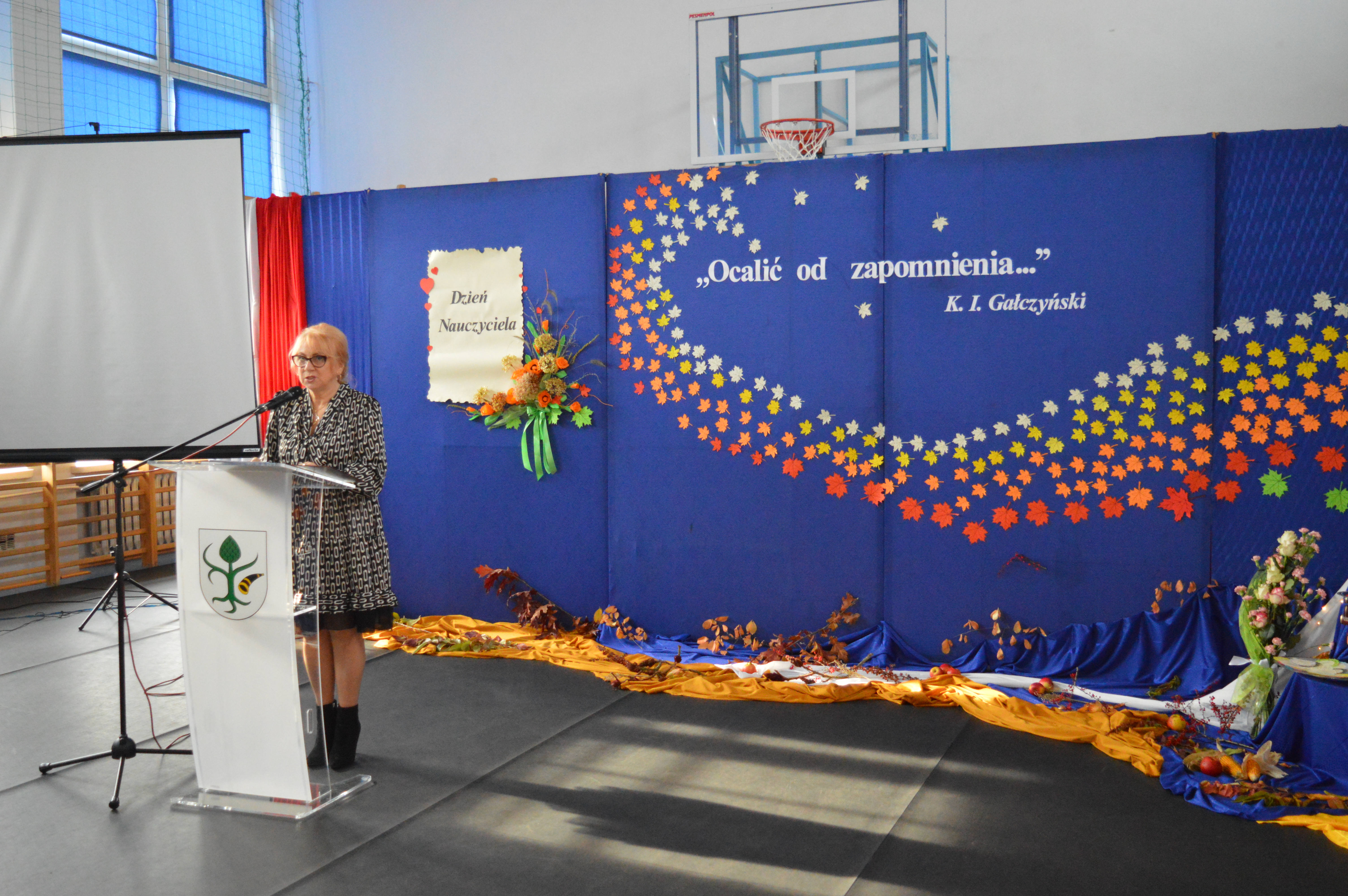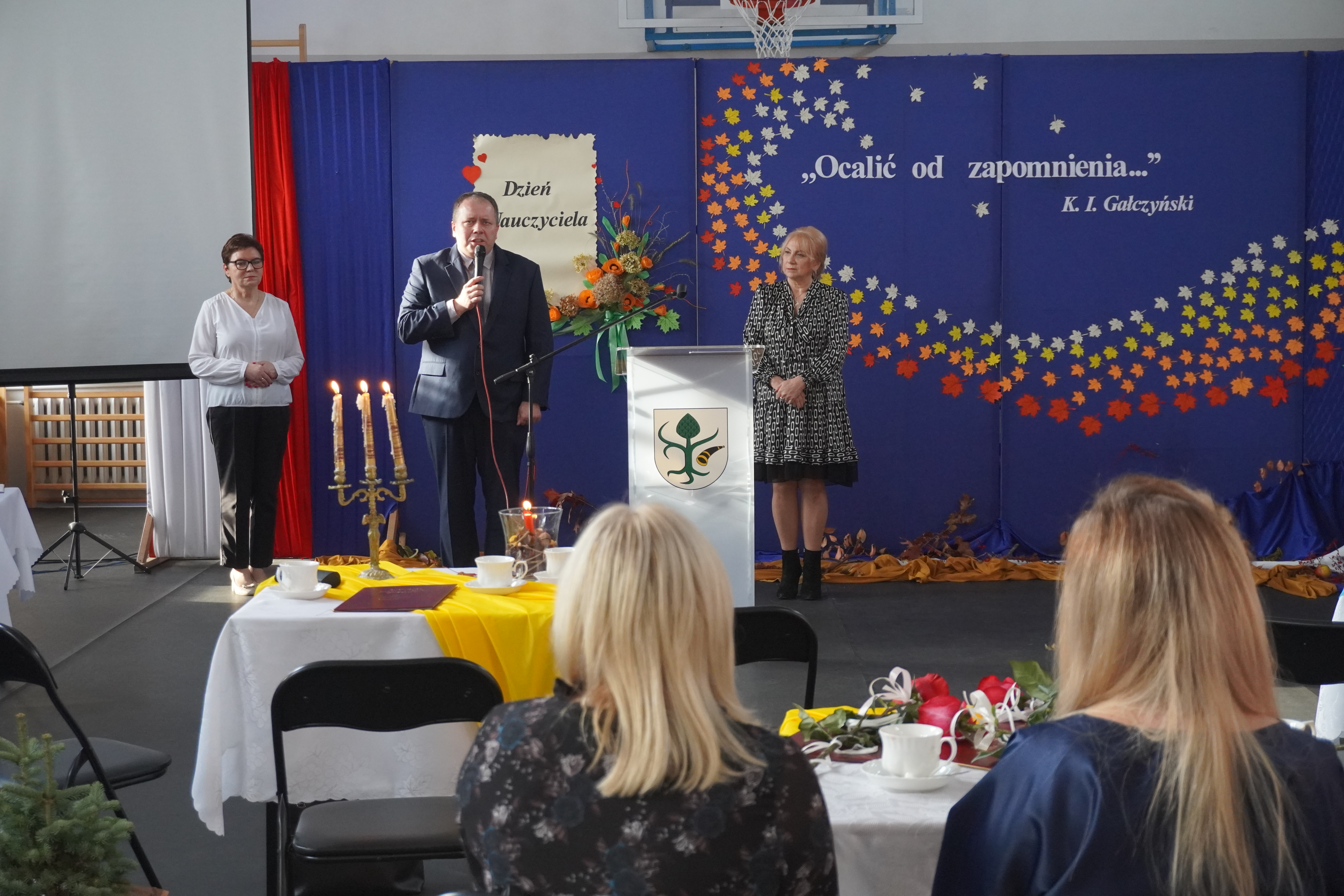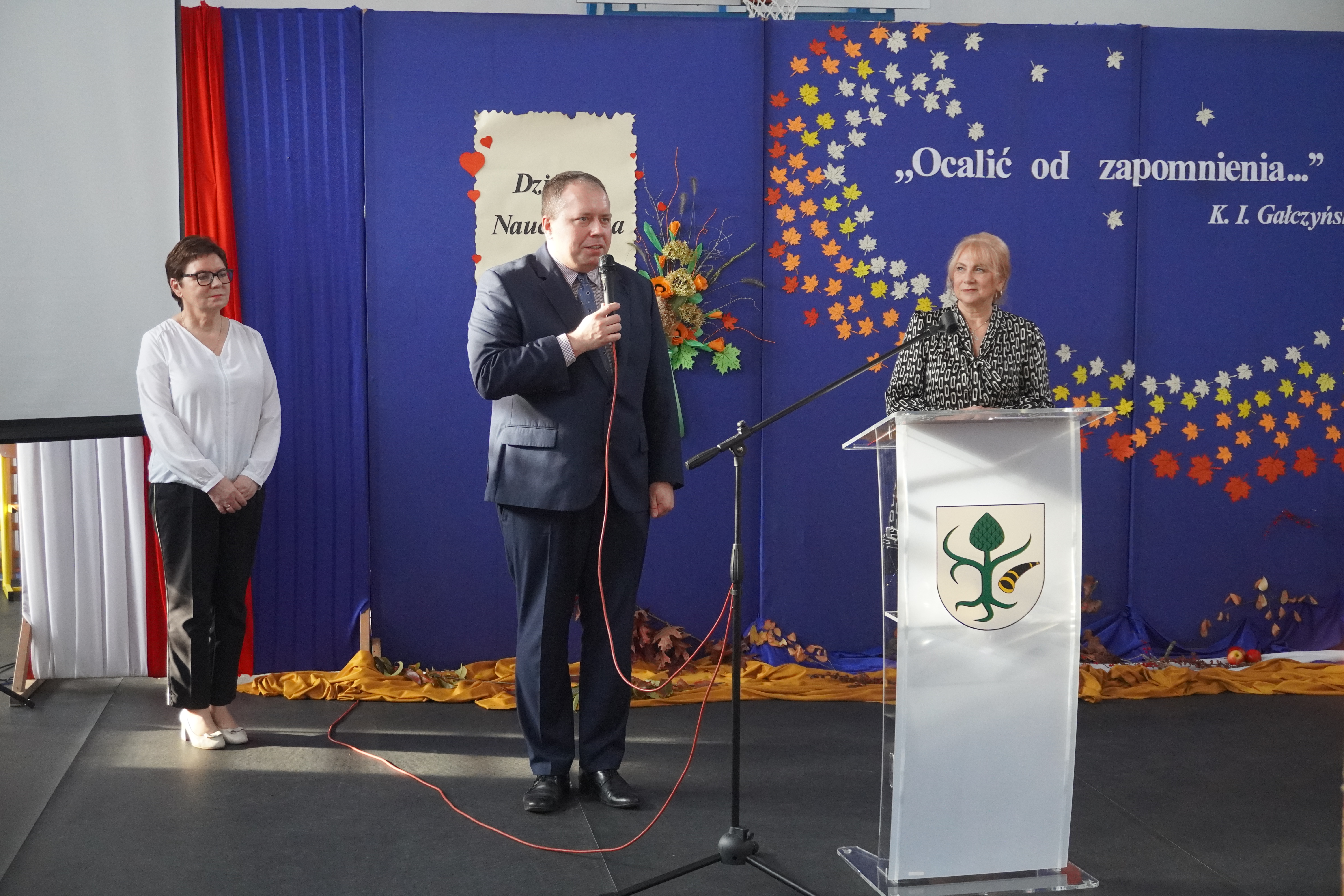Głos zabierali również goście zaproszeni oraz dyrektorzy i nauczyciele. Dyrektor Michał Giers podziękował za zaproszenie i w równie pięknych słowach pogratulował władzom Gminy oraz wszystkim wyróżnionym i całej szkolnej społeczności, przybliżając rys historyczny polskiej oświaty. Życzenia przekazała również radna Wanda Jastrzębska.
