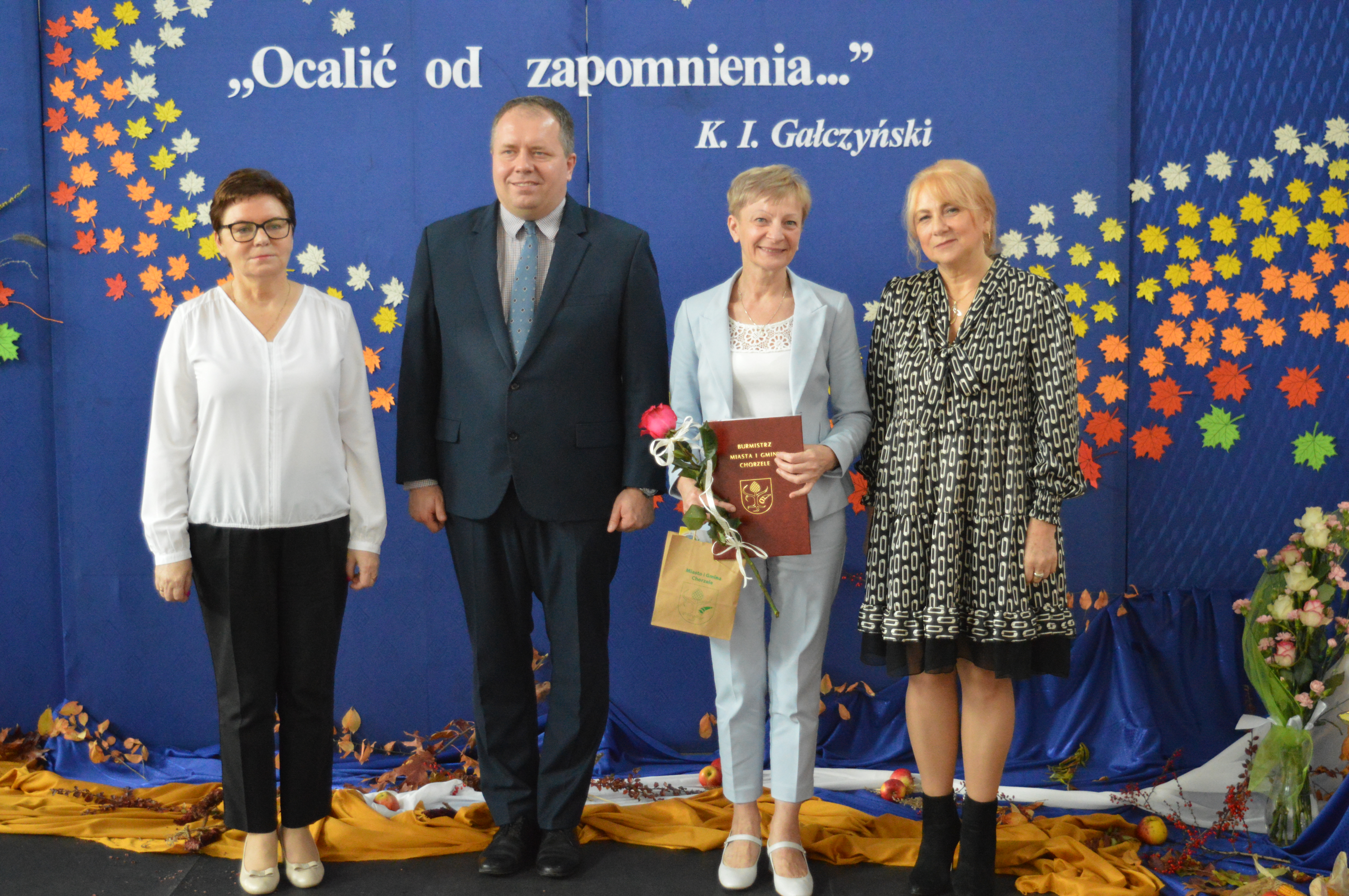 – Przez wiele lat tworzyliście Państwo fundamenty naszych szkół, trudząc się nad wychowaniem dziś dorosłych już pokoleń. Dziękuję za te wszystkie lata wytężonej pracy, zaangażowanie, serce włożone w edukację i wychowanie wielu pokoleń młodych ludzi. Dziękuję za wieloletni trud, poświęcenie i przewodnictwo w drodze do zdobywania wiedzy, odkrywania prawdy i kształtowania postaw. Wierzę, że z wiedzy tej kolejne pokolenia wychowanków będą korzystać przez resztę swojego życia i z pewnością przekażą ją dalej. Dzięki Państwa zaangażowaniu mogą z odwagą podejmować niełatwe wyzwania współczesnego świata, rozwijać zainteresowania, osiągać sukcesy. Składam Państwu najserdeczniejsze podziękowania za wspaniałą pracę, sukcesywną pomoc i poparcie dla inicjatyw służących dobru naszej Małej Ojczyzny. Doceniam Państwa nieustanne zaangażowanie w dynamiczny rozwój Gminy Chorzele – podkreśliła burmistrz.