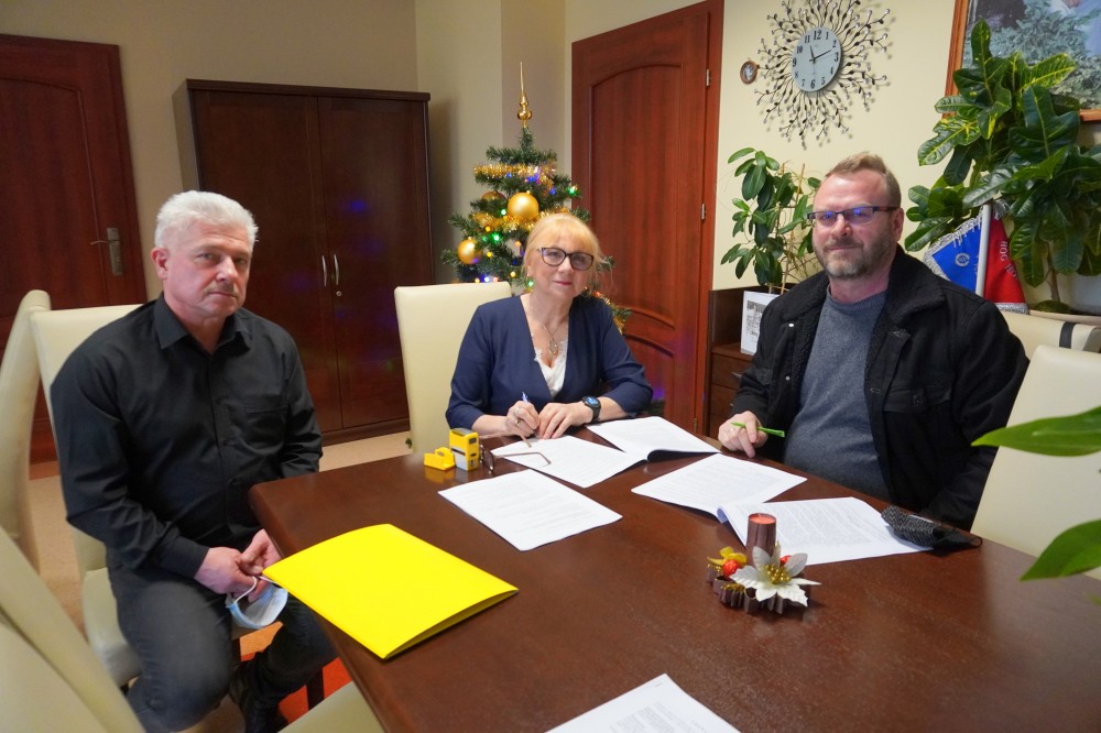 Zdjęcie przedstawia (od lewej): Pana Dariusza Wilgę pracownika UMiG, Burmistrza Miasta i Gminy Chorzele Beatę Szczepankowską oraz przedstawiciela jednej z wybranych firm - Pana Jacka Maksińskiego, podczas podpisania umowy.