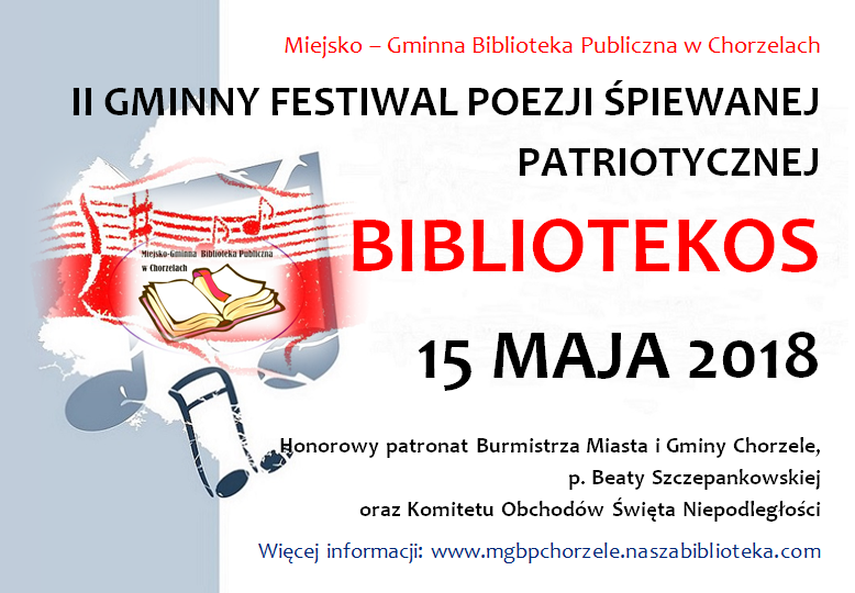 Zapraszamy na II Gminny Festiwal Poezji Śpiewanej Patriotycznej "Bibliotekos" 15 Maja 2018 roku organizowany przez Miejsko - Gminną Bibliotekę Publiczną w Chorzelach. Honorowy patronat nad wydarzeniem objęła Burmistrz Miasta i Gminy Chorzele Beata Szczepankowska oraz Komitet Obchodów Święta Niepodległości.
