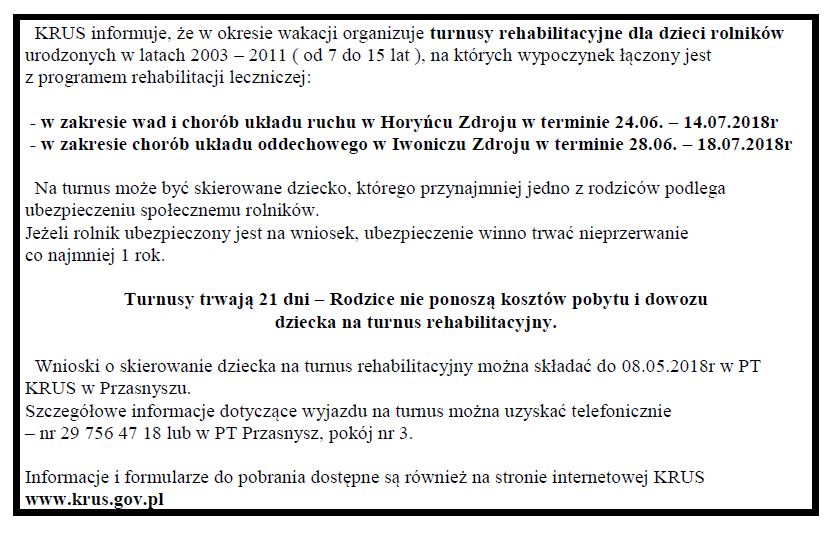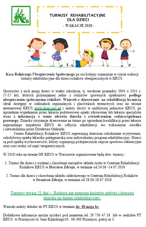 KRUS informuje, że w okresie wakacji organizuje turnusy rehabilitacyjne dla dzieci rolników urodzonych w latach 2003 – 2011 ( od 7 do 15 lat ), na których wypoczynek łączony jest z programem rehabilitacji leczniczej: - w zakresie wad i chorób układu ruchu w Horyńcu Zdroju w terminie 24.06. – 14.07.2018r