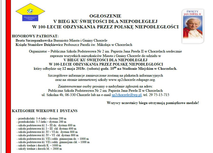 Publiczna Szkoła Podstawowa Nr 2 im. Papieża Jana Pawła II w Chorzelach serdecznie zaprasza wszystkich mieszkańców Miasta i Gminy Chorzele do udziału w V BIEGU KU ŚWIĘTOŚCI DLA NIEPODLEGŁEJ W 100-LECIE ODZYSKANIA PRZEZ POLSKĘ NIEPODLEGŁOŚCI