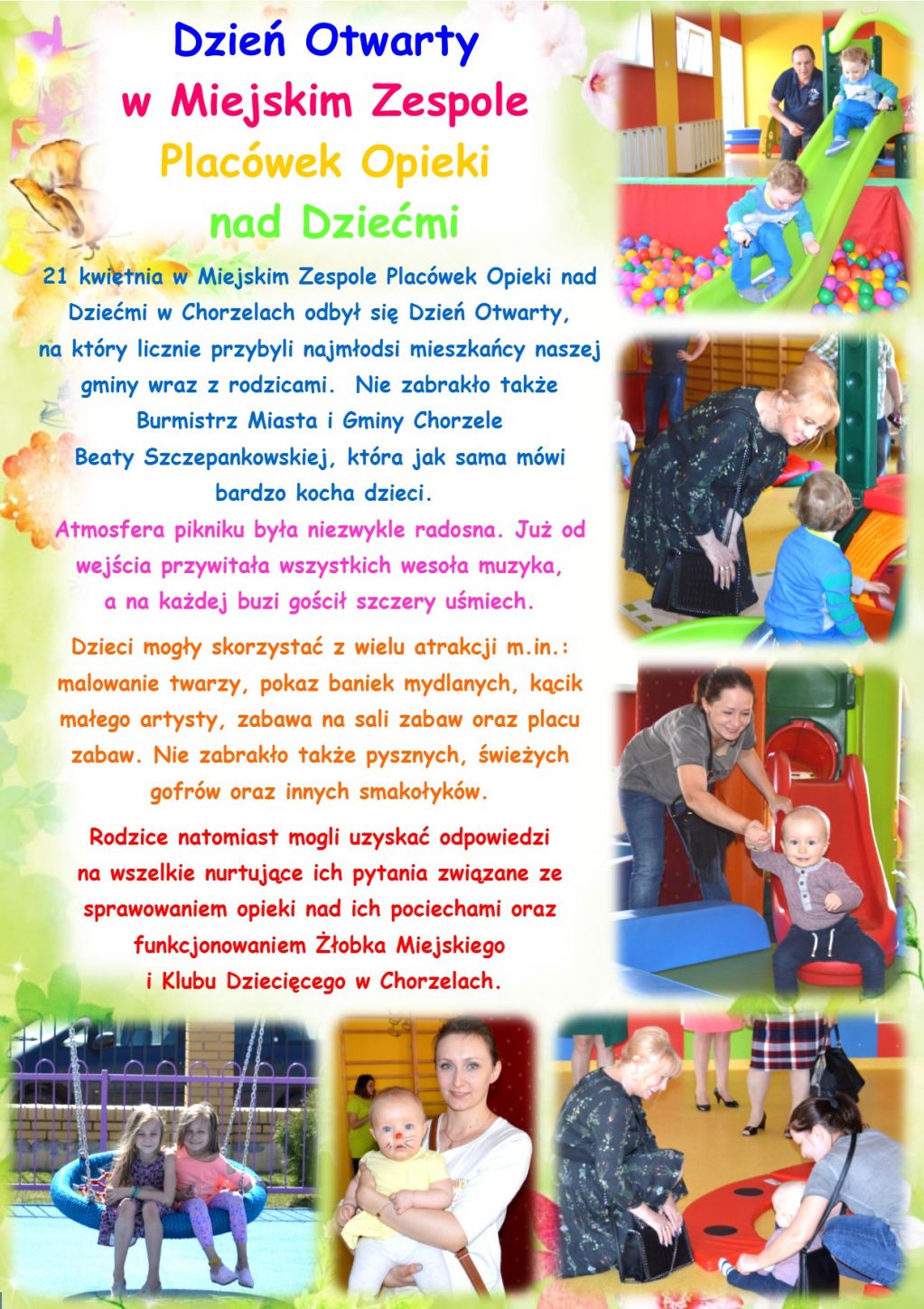 21 kwietnia w Miejskim Zespole Placówek Opieki nad Dziećmi w Chorzelach odbył się Dzień Otwarty, na który licznie przybyli najmłodsi mieszkańcy naszej gminy wraz z rodzicami. Nie zabrakło także Burmistrz Miasta i Gminy Chorzele Beaty Szczepankowskiej, która jak sama mówi bardzo kocha dzieci.
