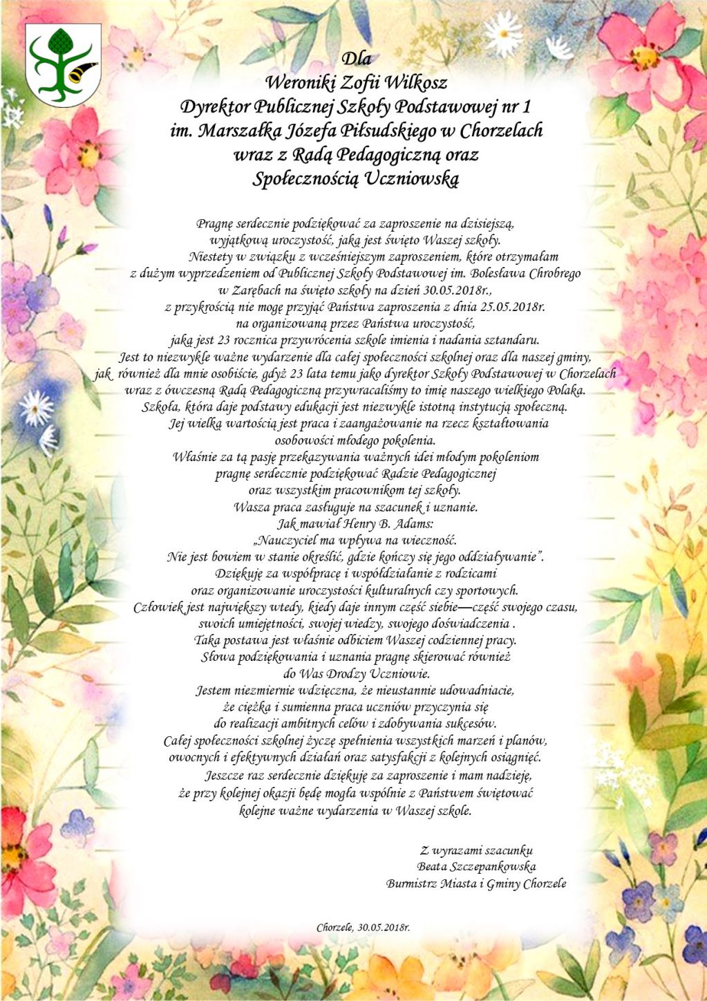 Życzenia dla Publicznej Szkoły Podstawowej nr 1 im. Marszałka Józefa Piłsudkiego w Chorzelach